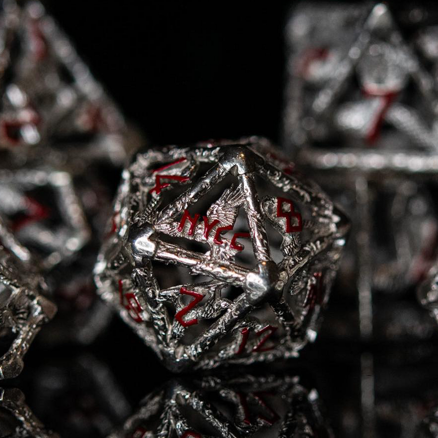 Get rolling with this striking silver dice set! Made for New York City Comic Con, these dice feature NYCC on the D20. Our own Misty Mountain Gaming dice design team crafted unique, detailed patterns of ravens, wolves, and snakes - a thrilling addition to your collection!