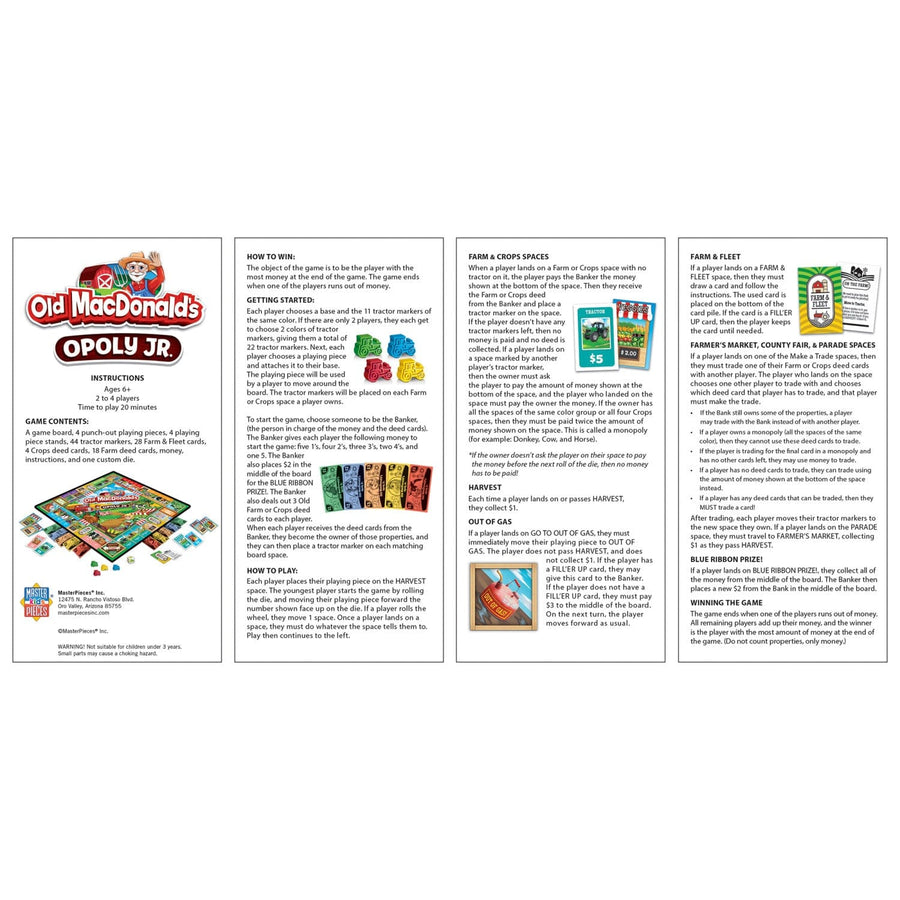 So come on down to Old MacDonald's Farm and have a great time. With this fun-filled game, you'll be able to explore everything the farm has to offer. Thanks for choosing Old MacDonald's Farm Opoly Junior!