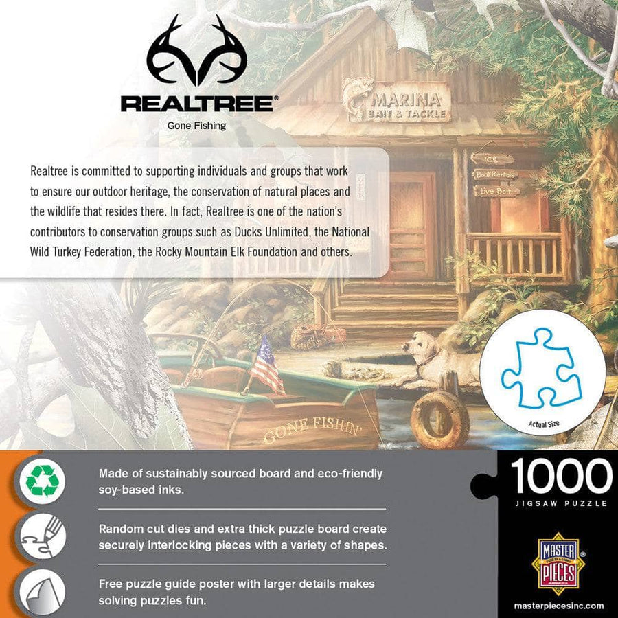 These MasterPieces 19.25" x 26.75" 1000pc Realtree Puzzle of Gone Fishing features a relaxing cabin scene with lakeside fishing with the boat parked in front ready to go. What a great way to live! This was beautifully painted by artist, Dona Gelsinger. Gelsinger is inspired by the natural beauty and abundant wildlife throughout her hometown in the Rogue River Valley of Southern Oregon. She brings nature to life with her keen eye and practiced strokes, making you feel as if you're right there, taking a peek at nature's most magnificent creatures. Hand painted artwork by Dona Gelsinger is combined with exact Realtree patterns to create a one-of-a-kind image. To reduce their impact on our environment, the chipboard used in these puzzles is made of 100% recycled material.