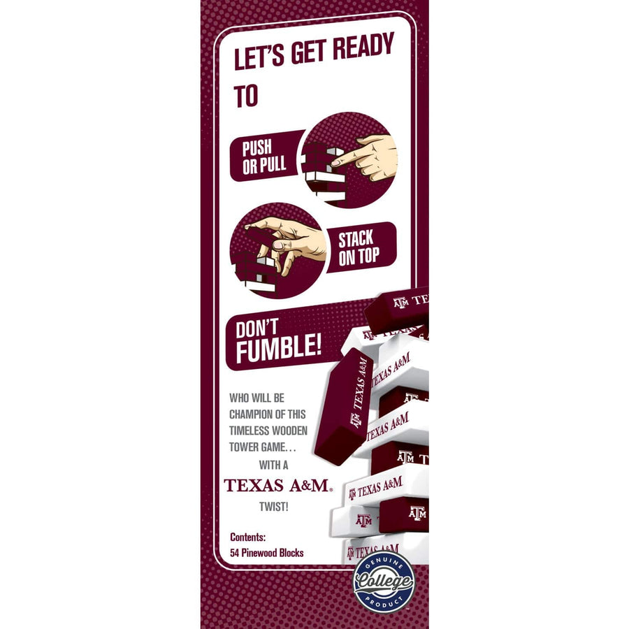 Experience the thrill of game day with the MasterPieces Game Day - NCAA Texas A&M Aggies Tumble Tower. This classic wooden game is perfect for Texas A&M fans, featuring 18 team-themed mini wooden blocks that bring the spirit of the Aggies to your living room. As you stack each block, the challenge intensifies, making it a fun and engaging activity for kids and adults alike. Ideal for Texas A&M parties or as part of your Texas A&M decor, this game is a must-have for any fan's collection. The Tumble Tower is designed for 1+ players, ensuring endless entertainment whether you're playing solo or with friends. Made from real wood, it offers durability and a premium feel, perfect for those who appreciate quality Texas A&M merchandise. With dimensions of 9.02 x 3.27 x 3.27 inches, it's compact enough to take to tailgates or gatherings, yet substantial enough to make an impact. Weighing just 1.64 pounds, it's easy to transport and set up. This game is not only a great addition to your Texas A&M party supplies but also makes a fantastic gift for any Texas Aggies fan. Suitable for ages 6 and up, it provides a safe and enjoyable experience for the whole family. Whether you're looking for Texas A&M games or unique Texas A&M ornaments, this Tumble Tower is a versatile choice that combines fun and team spirit. Assembly is required, but the straightforward setup means you'll be playing in no time. Add this officially licensed Texas A&M Tumble Tower to your collection and enjoy hours of strategic fun.