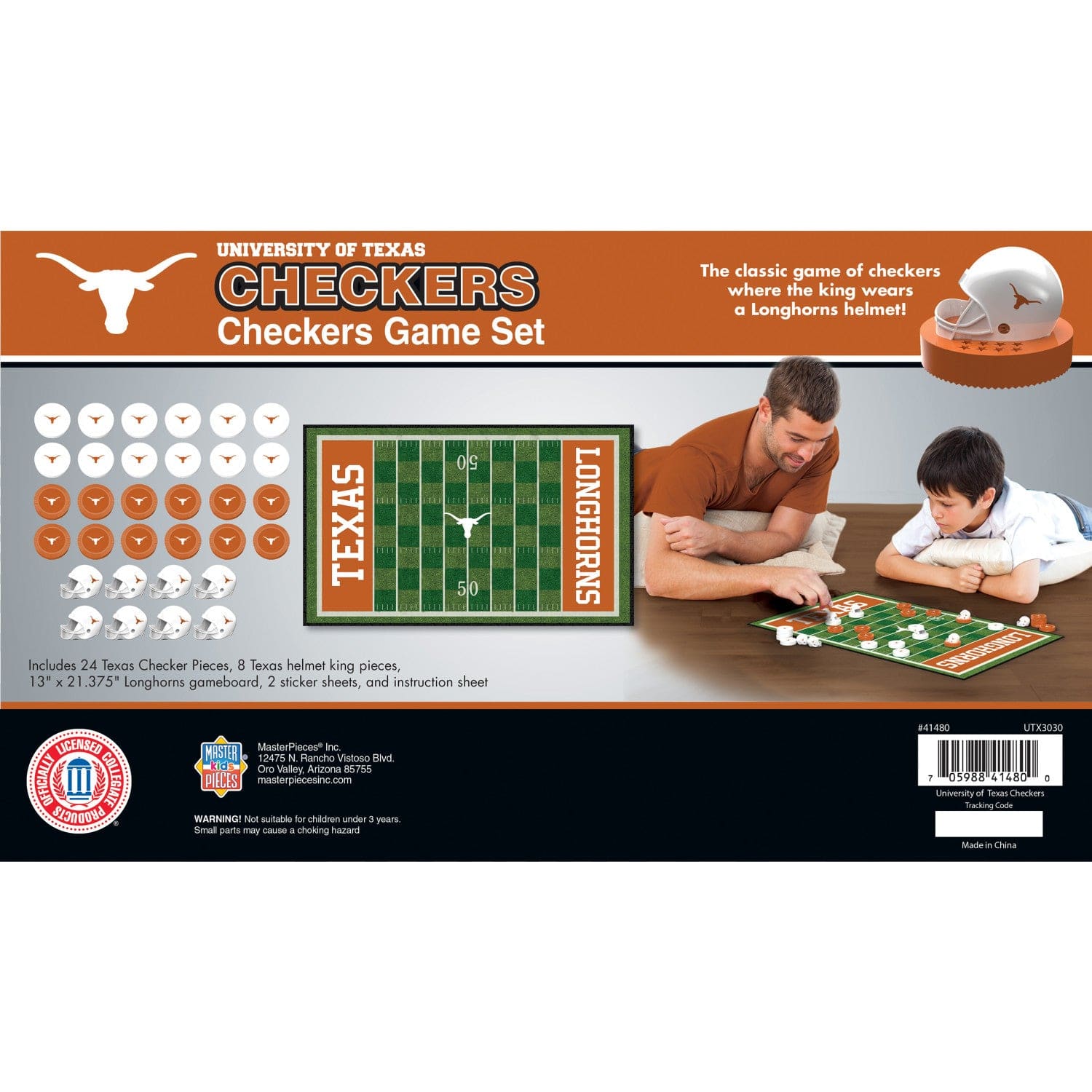 Bring the excitement of college football checkers to your next game night with this officially licensed Texas Longhorns checkers board game, designed for both kids and adults. Featuring vibrant team colors and logos, this Texas themed board game is perfect for fans looking to showcase their school spirit. The set includes everything needed for two players, making it a great choice for family gatherings or friendly competition. With a sturdy board measuring 13" x 21" and lightweight construction at just 1.1 pounds, it’s easy to set up and store. The unique crown pieces add a fun twist, letting players compete to see who will win and wear the crown. Ideal for fans of university of Texas board games, this checkers board game for adults and kids is a standout addition to any Texas Longhorns merchandise collection. Suitable for ages 6 and up, it’s a safe and engaging way to introduce young fans to classic board games while celebrating their favorite team. Whether you’re searching for Texas Longhorns toy gifts or looking to expand your collection of NCAA checkers, this game delivers hours of entertainment and team pride.