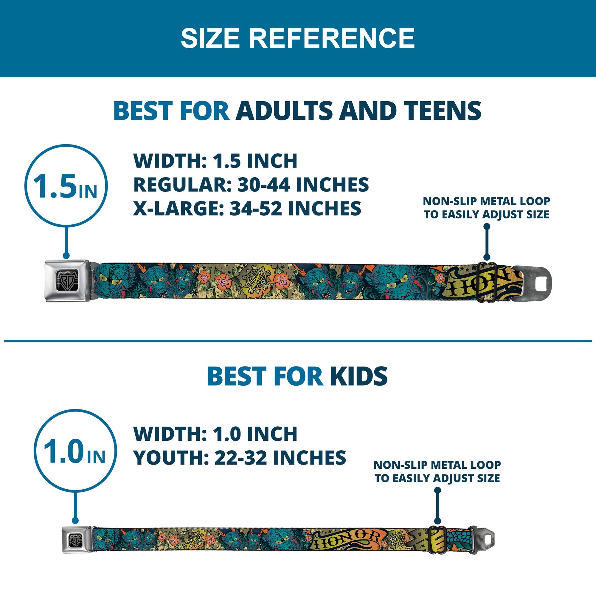 - Our adult-size Seatbelt Belts are 1.5 inches wide and our kid-sized Seatbelt Belts are 1.0 inch wide.