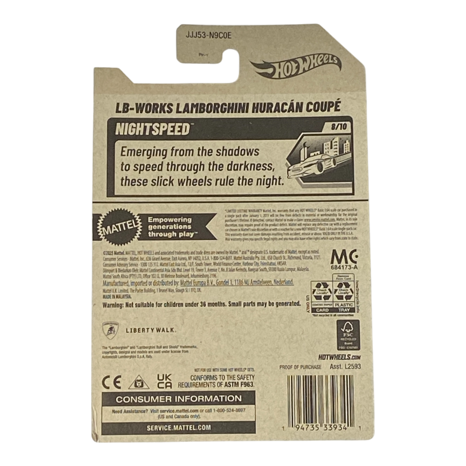 Unleash supercar power with the 2026 Hot Wheels LB-Works Lamborghini Huracan Coupe from the HW Nightspeed Series (8/10). This stunning 1:64 scale diecast features the aggressive widebody kit from LB-Works, complete with massive aero, lowered stance, and dramatic styling on the iconic Lamborghini Huracan platform. Finished in deep metallic black with glowing neon purple and cyan accents, this fresh mainline release (Hot Wheels #189/250, new variation LPP91) delivers premium detail and high-visibility Nightspeed flair perfect for display or racing shelves.