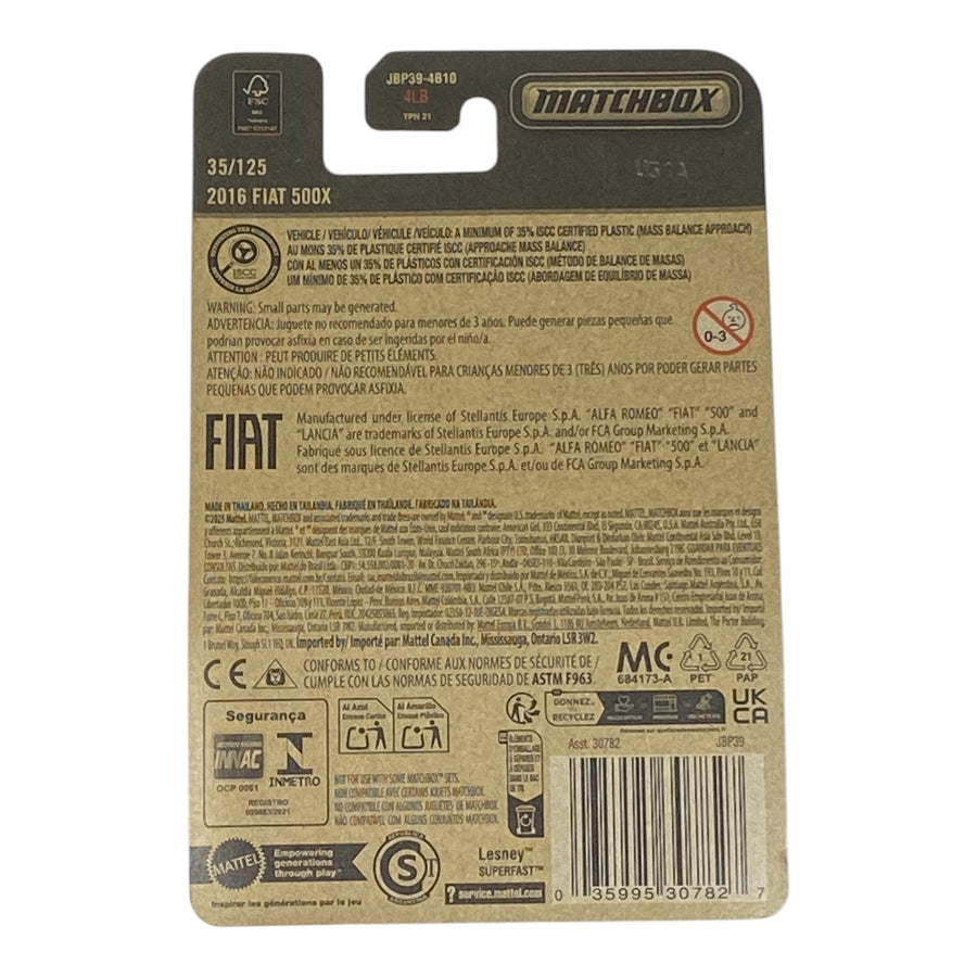 Discover the 2025 Matchbox 2016 Fiat 500X (#35/125), a stylish standout in the expanded Mainline series! This 1:64 scale diecast compact crossover dazzles in a vibrant blue finish, featuring detailed headlights, grille, tinted windows, authentic Fiat badging, and realistic wheels – perfect for Matchbox collectors seeking modern Italian crossover replicas.