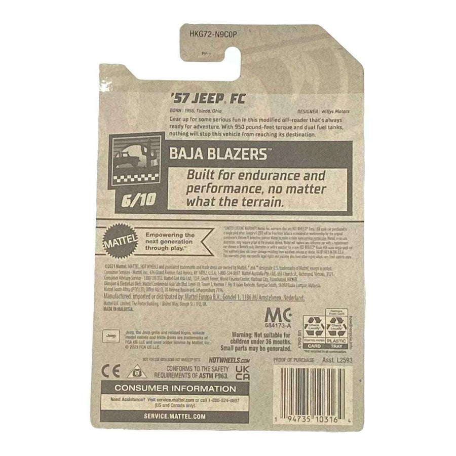 This unique 57 Jeep FC model is an exemplary representation of Hot Wheels' attention to detail. As soon as you hold it in your hands, you can admire the vibrant colors, intricate details, and precision craftsmanship that Hot Wheels is famous for. The Baja Blazers Series emphasizes off-road performance and aesthetic appeal, making this jeep a standout piece in any collection.