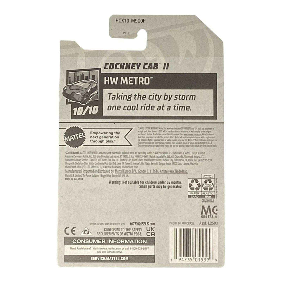 Collectors will appreciate the Cockney Cab's unique place in the Hot Wheels family, as it is part of the Metro Series 10/10. This series is known for its attention to detail and the incorporation of urban elements into the design of each car. The Cockney Cab not only adds to the series but also elevates your Hot Wheels collection to new heights.