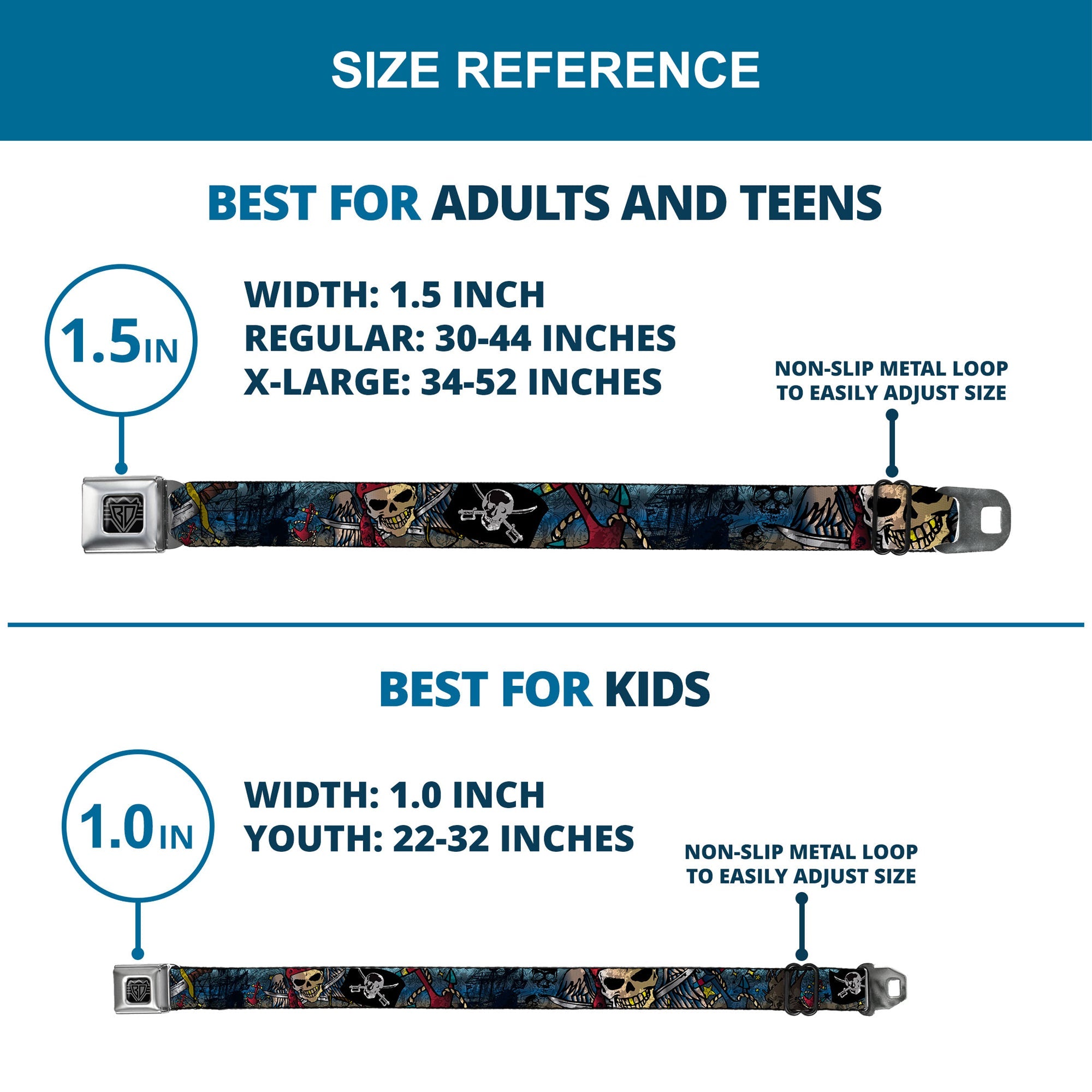 - Our adult-size Seatbelt Belts are 1.5 inches wide and our kid-sized Seatbelt Belts are 1.0 inch wide.