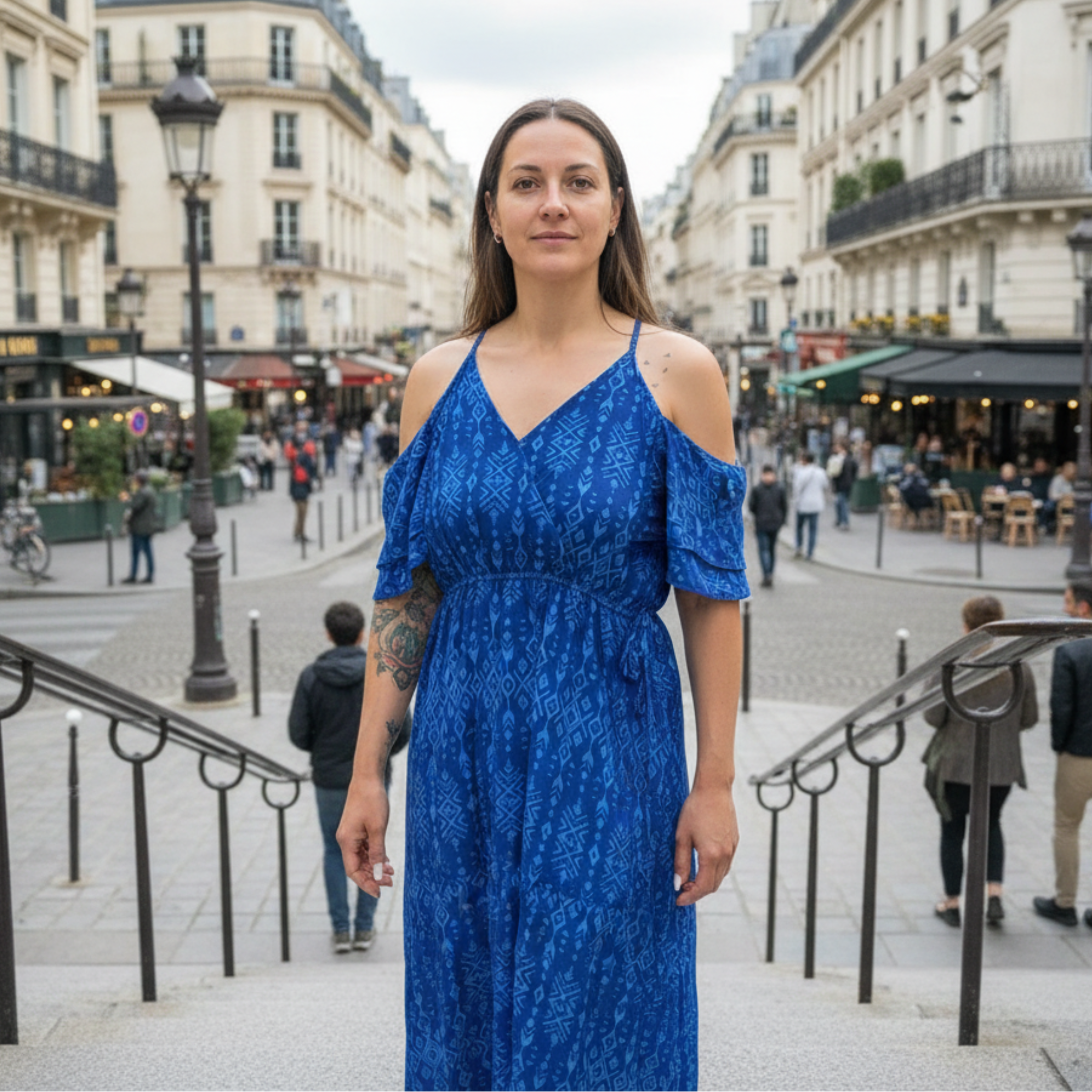 - Spaghetti straps and flowly cold-shoulder sleeves