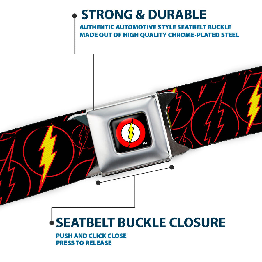 - Belts are made with authentic automotive style seatbelt buckles making them easy to open and close at the push of a button.