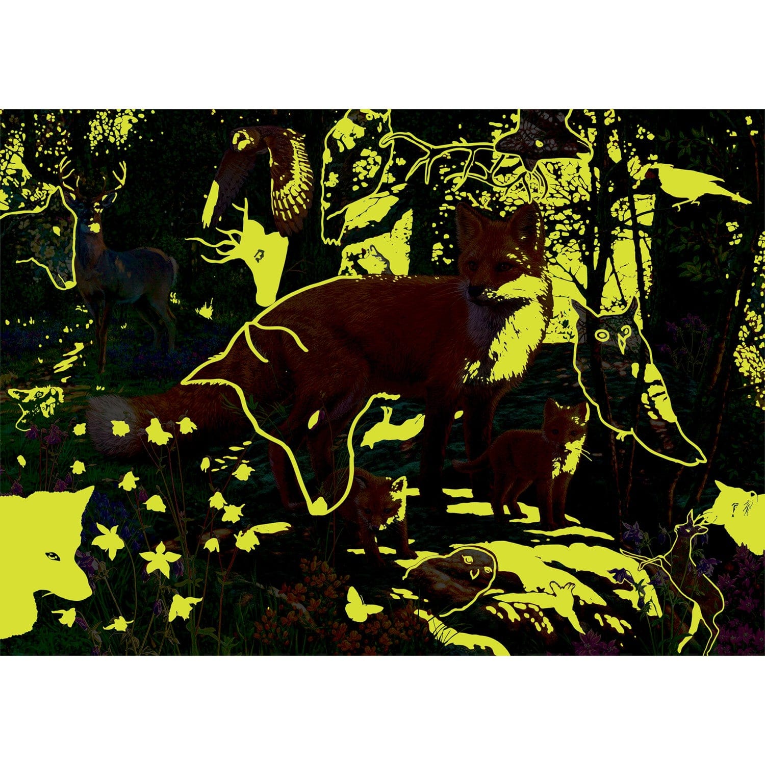This MasterPieces 15" x 21" 500pc  Hidden Image Glow-in-the-Dark Puzzles features a close-up of a beautiful fox, roaming the forest with all his animal friends. Can you find all 14 hidden animals? Some glow-in-the-dark and others are hiding in plain sight! Artist, Steve Read hides amazing hidden images within each beautiful piece of art, and his puzzles never disappoint. Find all the secrets in these wildly entertaining puzzles! To reduce their impact on our environment, the chipboard used in these puzzles is made of 100% recycled material.