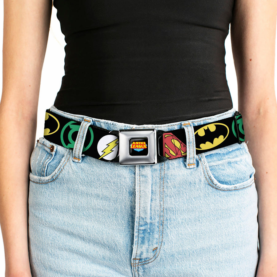 Justice League Shield Full Color Black Blue Red Yellow Seatbelt Belt - Justice League Superhero Logos CLOSE-UP Black Webbing