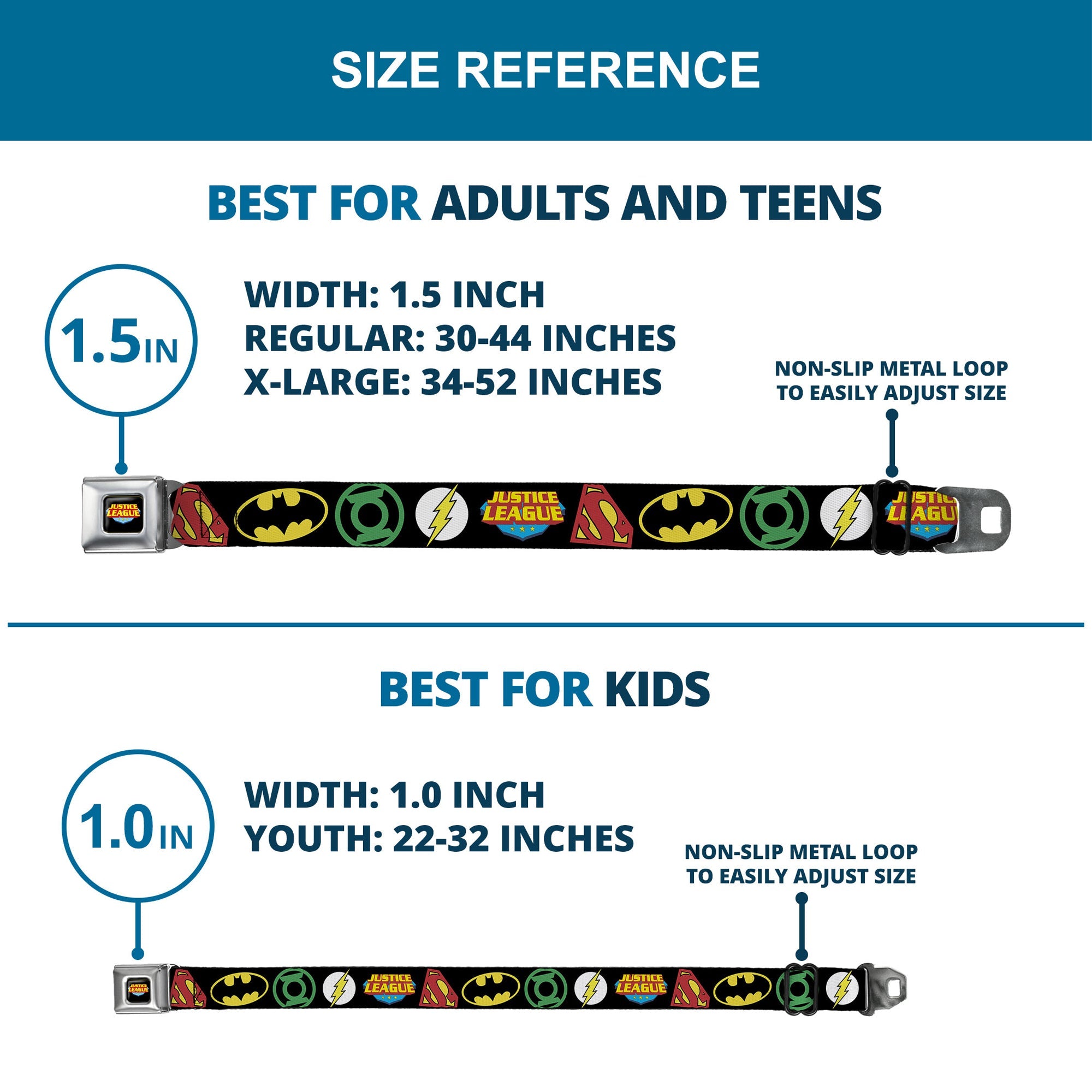 Buckle-Down's iconic Seatbelt Belt is a cool, smart, and exciting blend of fashion and function. Always a conversation starter, our Seatbelt Belt adjusts to perfectly fit your waist while showcasing your unique sense of style. Our Seatbelt Belts are made with authentic automotive style seatbelt buckles making them easy to open and close at the push of a button. Our adult-size Seatbelt Belts are 1.5 inches wide and our kid-sized Seatbelt belts are 1.0 inch wide. This product is Handcrafted in USA by Buckle-Down Inc. and officially licensed by DC Comics.