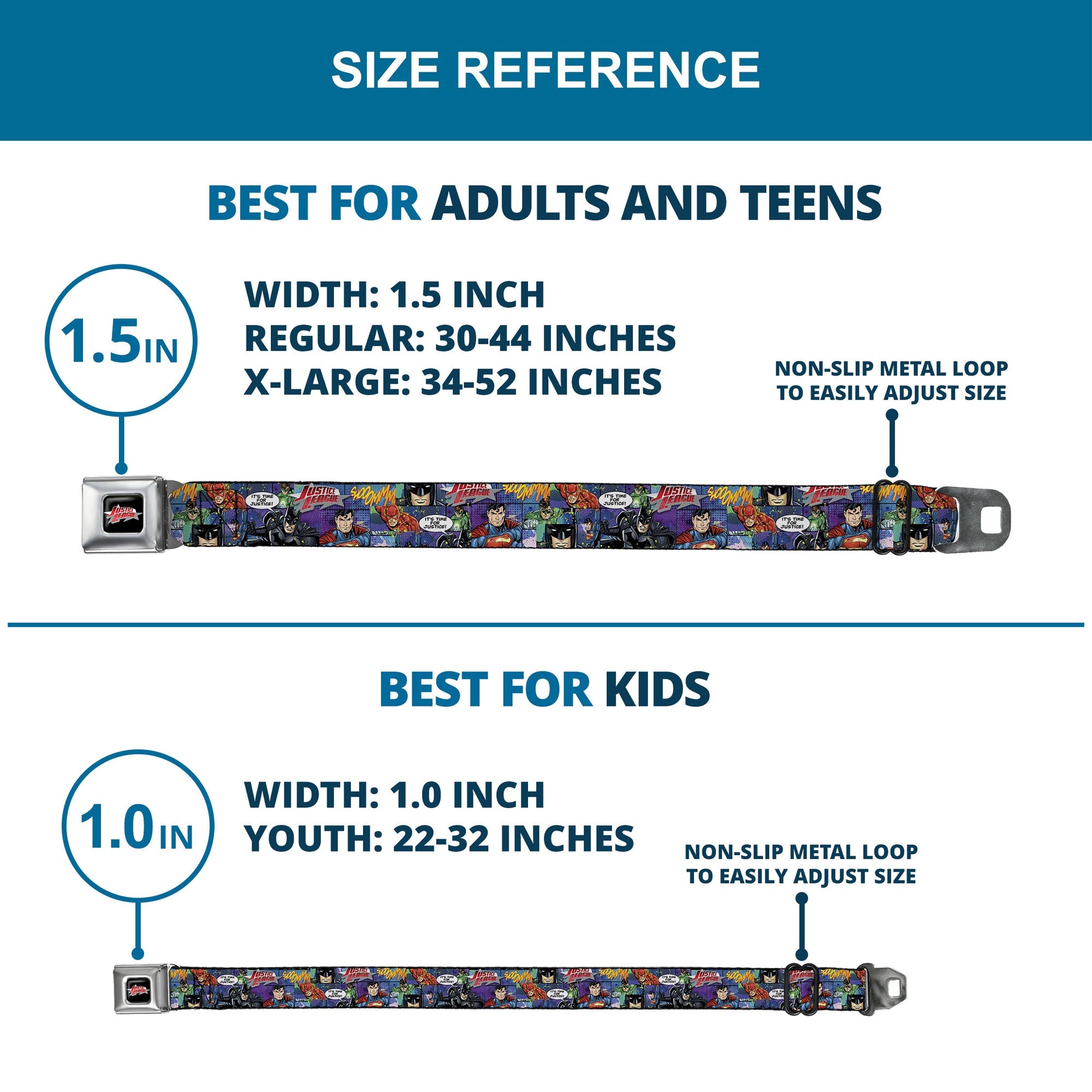 Buckle-Down's iconic Seatbelt Belt is a cool, smart, and exciting blend of fashion and function. Always a conversation starter, our Seatbelt Belt adjusts to perfectly fit your waist while showcasing your unique sense of style. Our Seatbelt Belts are made with authentic automotive style seatbelt buckles making them easy to open and close at the push of a button. Our adult-size Seatbelt Belts are 1.5 inches wide and our kid-sized Seatbelt belts are 1.0 inch wide. This product is Handcrafted in USA by Buckle-Down Inc. and officially licensed by DC Comics.