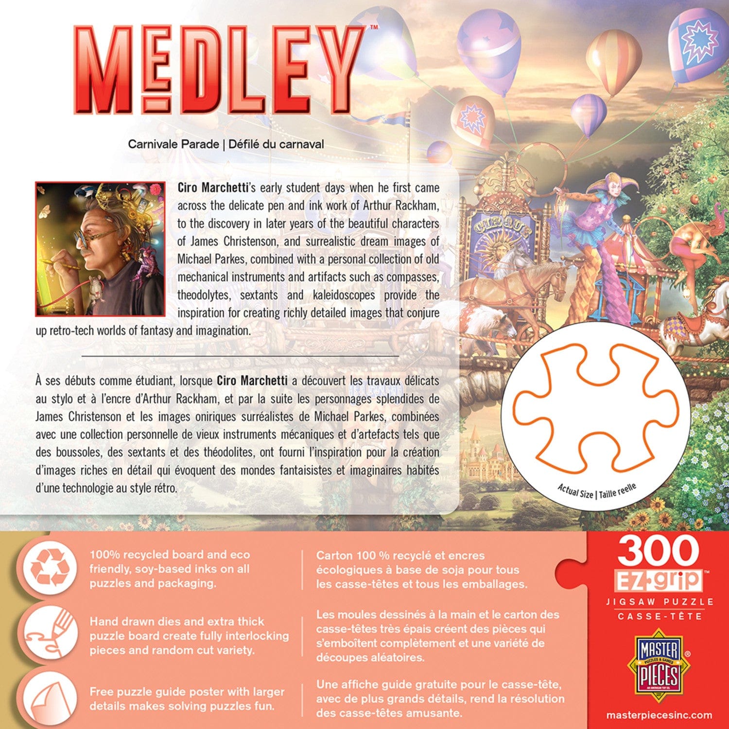 This MasterPieces 18" x 24" Medley 300PC EZ Grip Puzzle. A colorful carnival parade travels overland to the next magical castle. The EZ-Grip technology used to make this puzzle offers larger puzzle pieces that snap together perfectly, without compromising image quality. To reduce its impact on our environment, the chipboard used in this puzzle is made of 100% recycled material.