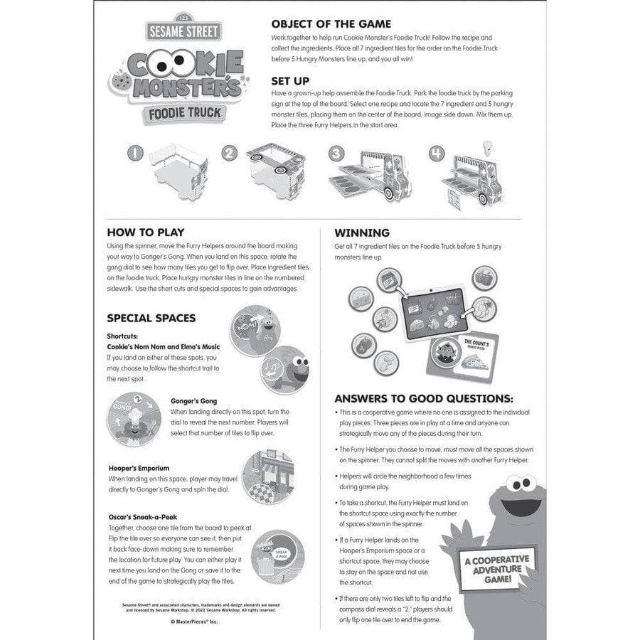 The MasterPieces Cookie Monster's Foodie Truck Sesame Street Coop Game is designed for children and adults aged 3 and up. This cooperative game encourages teamwork and cooperation. Take on the role of a chef and help Cookie Monster and Gonger run their food truck. Spin the dial, choose a recipe card, and work together to collect the ingredients before the hungry monsters form a line. With a game board, foodie truck, spinner, playing pieces, tokens, cards, and rules, this engaging game is perfect for 2-4 players and guarantees fun-filled hours of interactive play.
