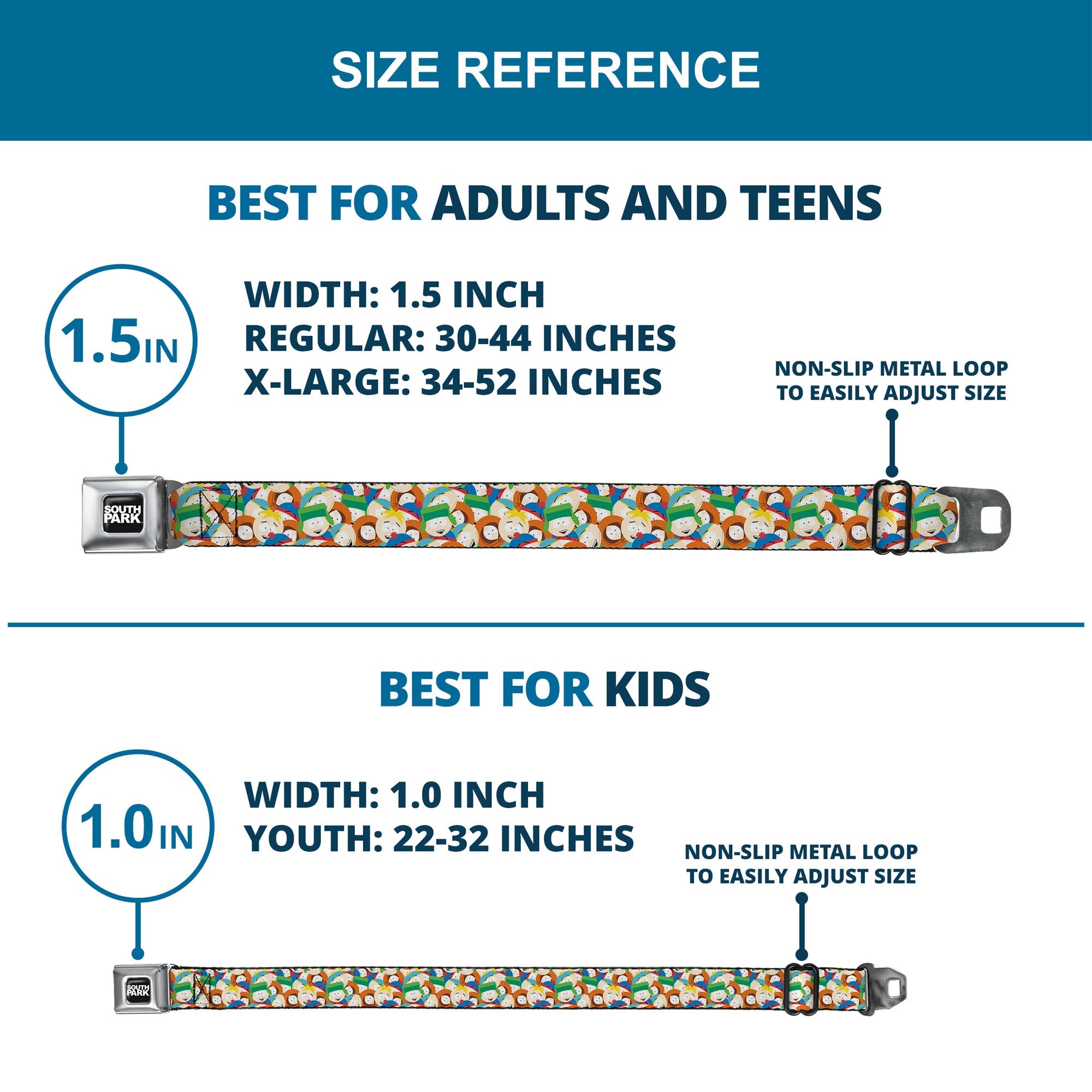 Buckle-Down's iconic Seatbelt Belt is a cool, smart, and exciting blend of fashion and function. Always a conversation starter, our Seatbelt Belt adjusts to perfectly fit your waist while showcasing your unique sense of style. Our Seatbelt Belts are made with authentic automotive style seatbelt buckles making them easy to open and close at the push of a button. Our adult-size Seatbelt Belts are 1.5 inches wide and our kid-sized Seatbelt belts are 1.0 inch wide. This product is Handcrafted in USA by Buckle-Down Inc. and officially licensed by Comedy Central.