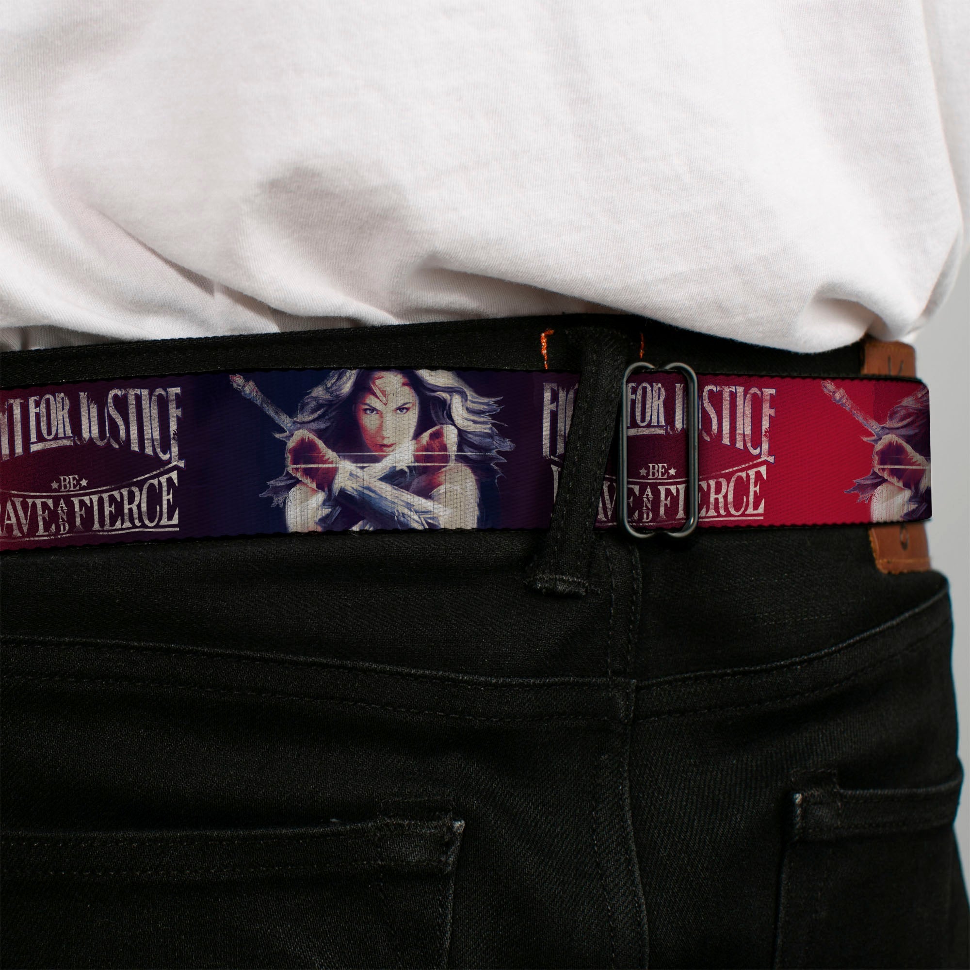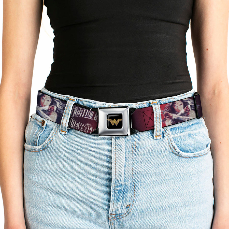 Wonder Woman 2017 Icon Full Color Black/Gold Seatbelt Belt - Wonder Woman Deflection Pose FIGHT FOR JUSTICE-BE BRAVE AND FIERCE Weathered Reds/Blues/White Webbing