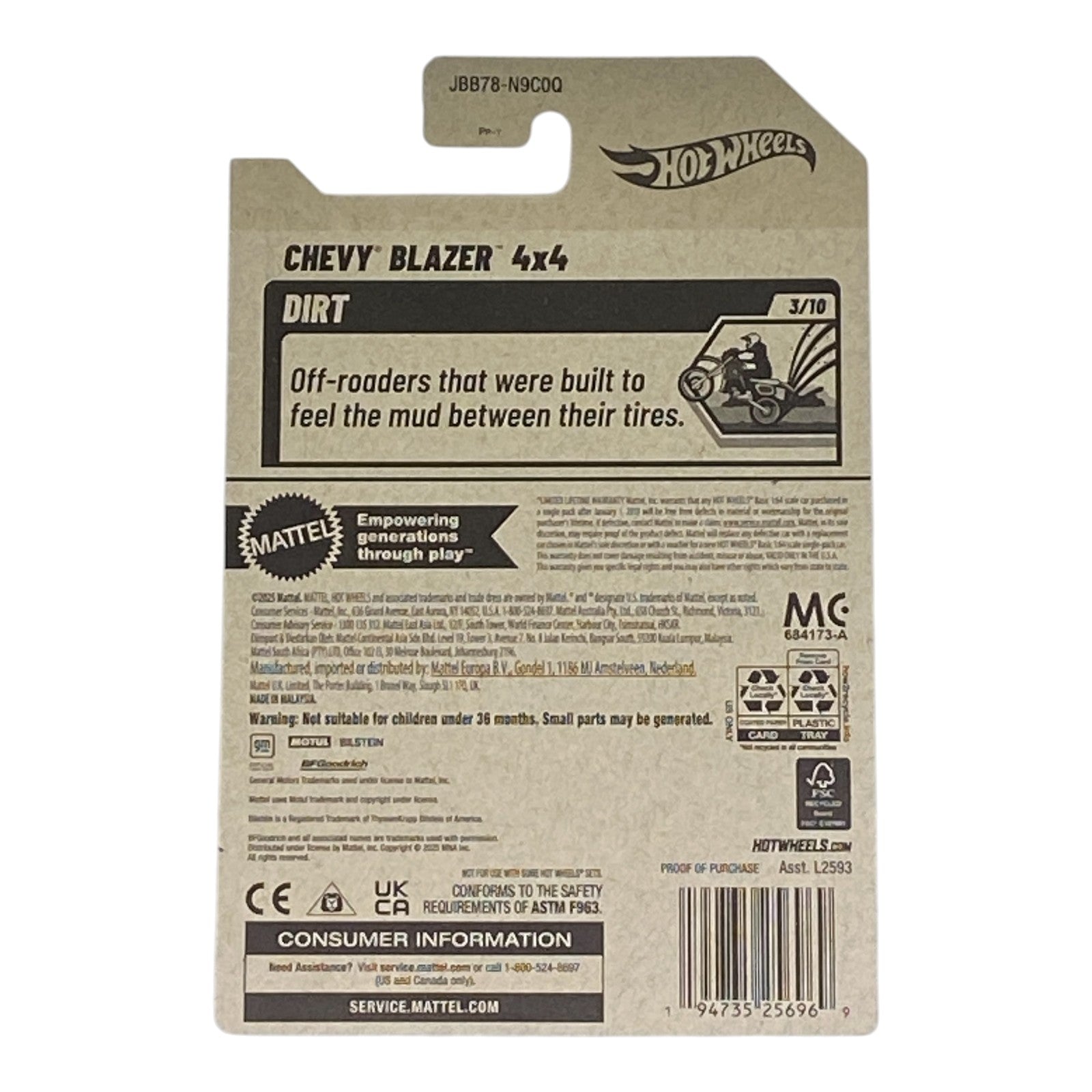 Unleash off-road excitement with the Hot Wheels Chevy Blazer 4X4 from the HW Dirt Series 3/10! This rugged die-cast model showcases the iconic Chevy Blazer 4X4 with bold detailing and a vibrant finish, perfect for collectors and adventure enthusiasts. Ideal for display or high-speed play, it brings gritty style to any Hot Wheels collection.