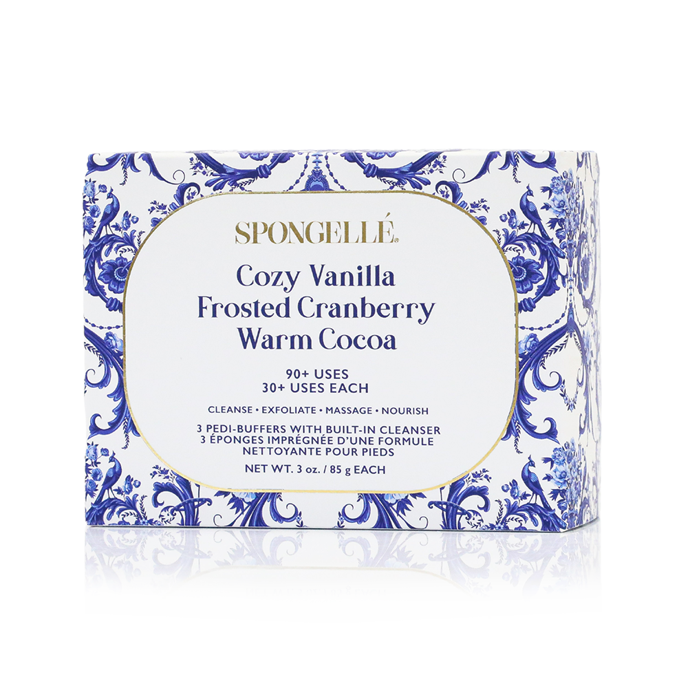 This trio set includes 3 Pedi Buffers in Cozy Vanilla, Frosted Cranberry, and Warm Cocoa. Each pre-filled Pedi Buffer is good for 30+ uses each.