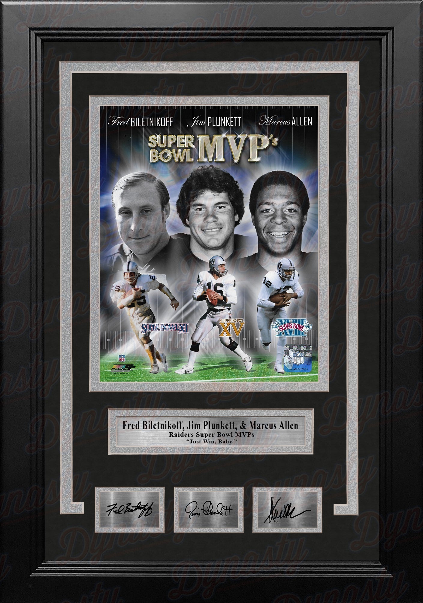 Officially licensed collage picture of Raiders Super Bowl MVPs Fred Biletnikoff, Jim Plunkett, & Marcus Allen