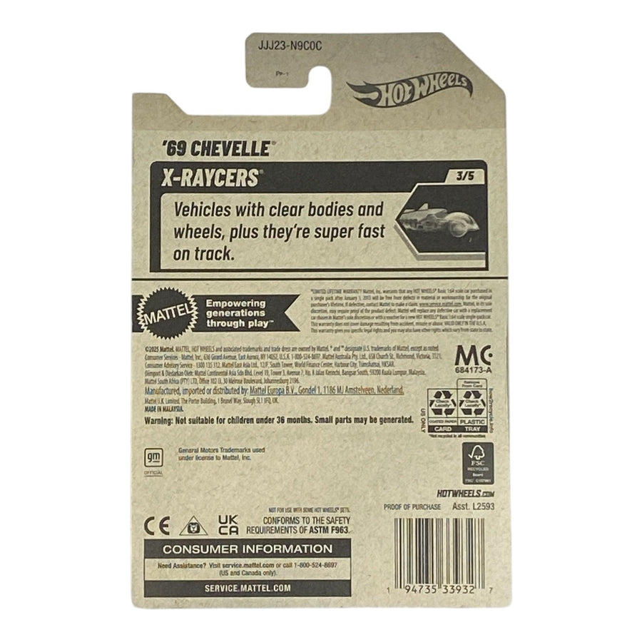The Hot Wheels '69 Chevelle in the X-Raycers Series 3/5 is a standout 2026 release featuring the classic 1969 muscle car with a fully transparent body that reveals its detailed V8 engine and chassis. This eye-catching X-Raycers design combines retro power with modern see-through style, making it a top pick for collectors and muscle car fans.