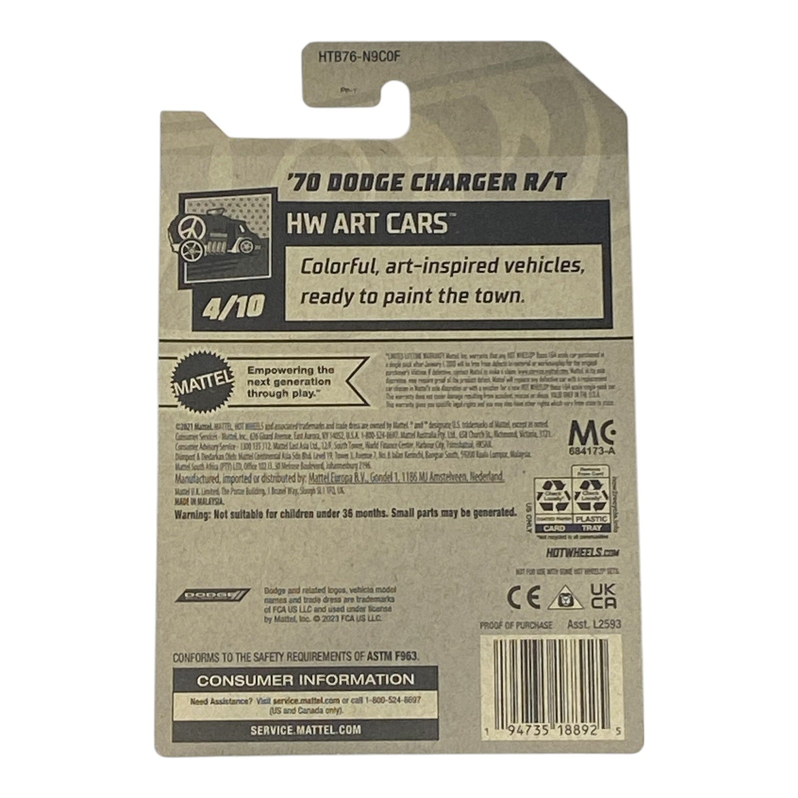 Discover the vibrant multicolor Hot Wheels '70 Dodge Charger R/T from the 2024 HW Art Cars Series (4/10, #108/250). This bold 1:64 scale diecast transforms the classic muscle car with psychedelic art-inspired graphics, blown hood, and explosive designs—perfect for collectors seeking unique Hot Wheels Dodge Charger models and artistic diecast vehicles.