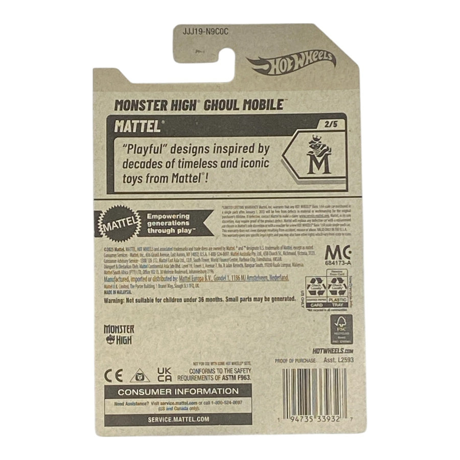The Hot Wheels Monster High Ghoul Mobile Mattel Series 2/5 is a thrilling die-cast replica of the famous Monster High vehicle, blending spooky details with Hot Wheels performance for an unforgettable collectible that delights fans of both iconic Mattel brands.