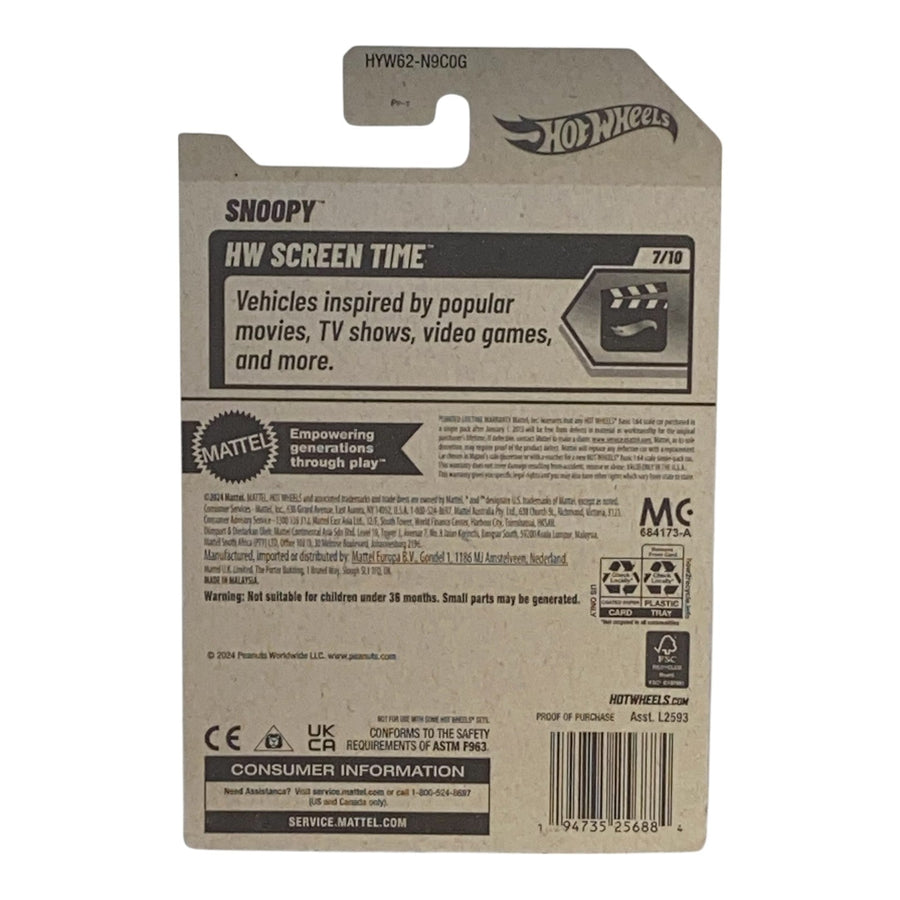 Released as part of the HW Screen Time Series (7/10), this iconic car pays homage to Charles Schulz's beloved character, Snoopy. With its detailed design and eye-catching graphics, the Hot Wheels Snoopy captures the spirit of adventure that fans of the Peanuts gang have come to adore. Whether you're racing against friends or showcasing it in your display case, it's designed to impress. Here are some key features of the Hot Wheels Snoopy:
