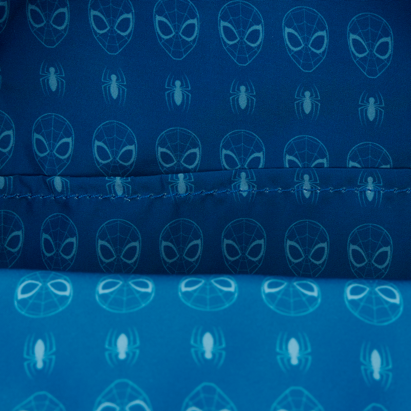 This mini backpack features a sherpa, heart-shaped front pocket featuring Spider-Man's mask. All over the rest of the bag, you'll find various symbols of Spider-Man in squares that look stitched together. Plus, the zipper pull on the front pocket features Spider-Man's mask!