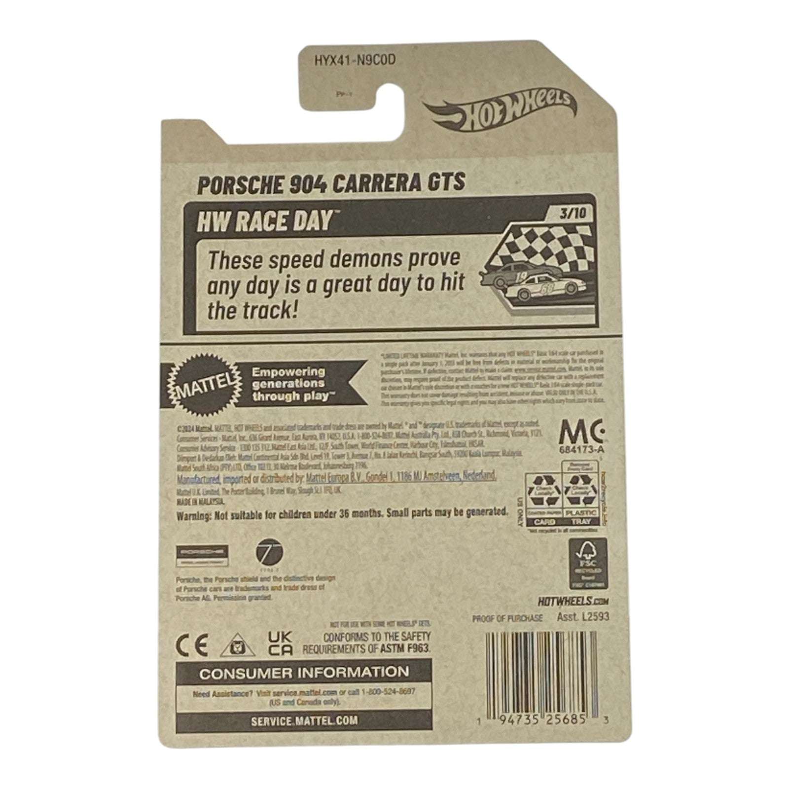 Whether you’re adding to your collection or inspiring a new generation of car lovers, the Hot Wheels Porsche 904 Carrera GTS delivers on all fronts. Its combination of design fidelity and playability makes it an essential piece for both display and play. Each vehicle in the HW Race Day Series is meticulously engineered to ensure that every detail captures the spirit of the race scene.