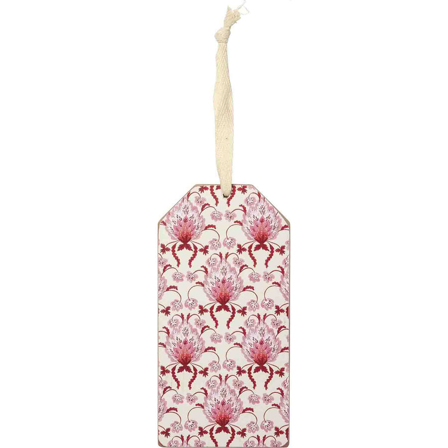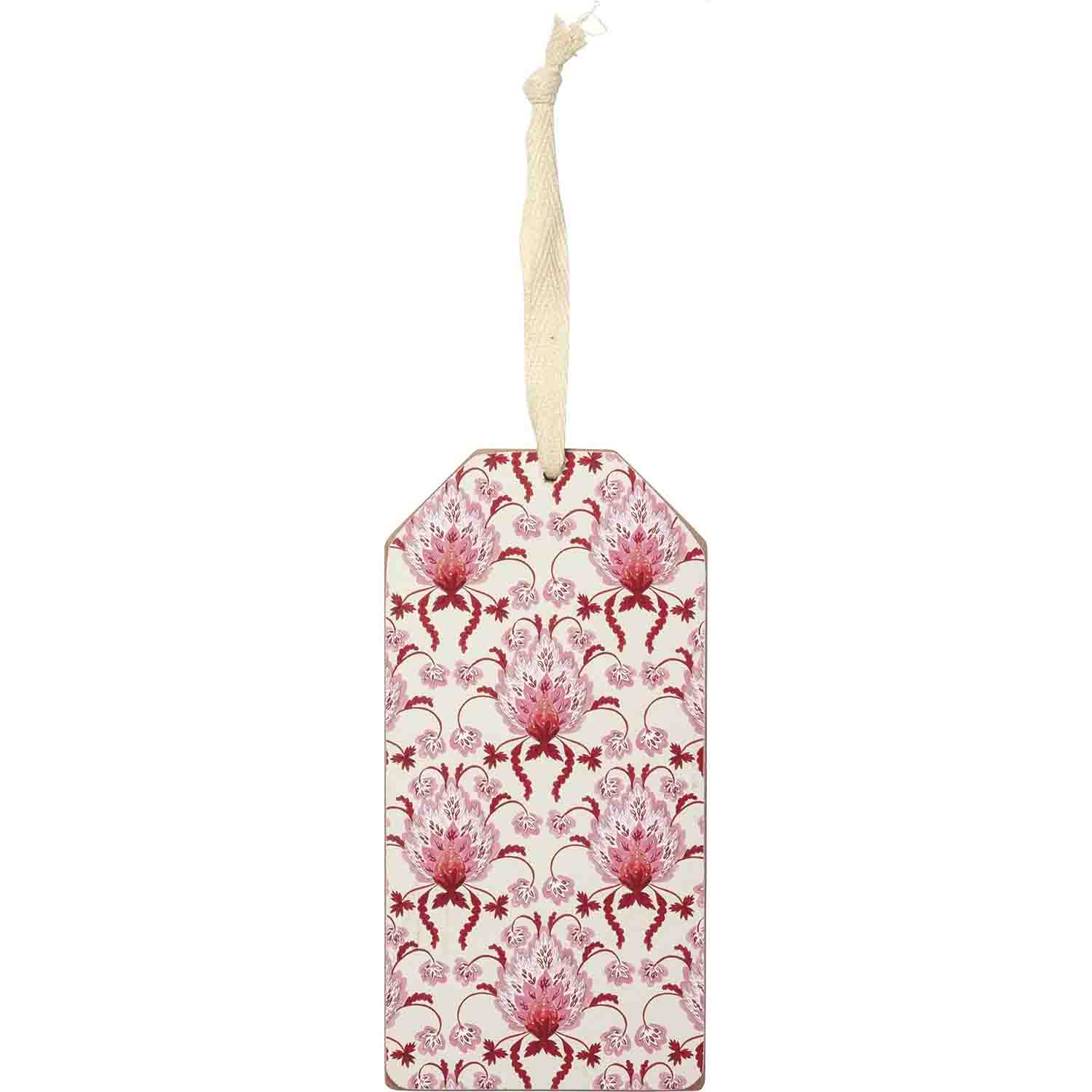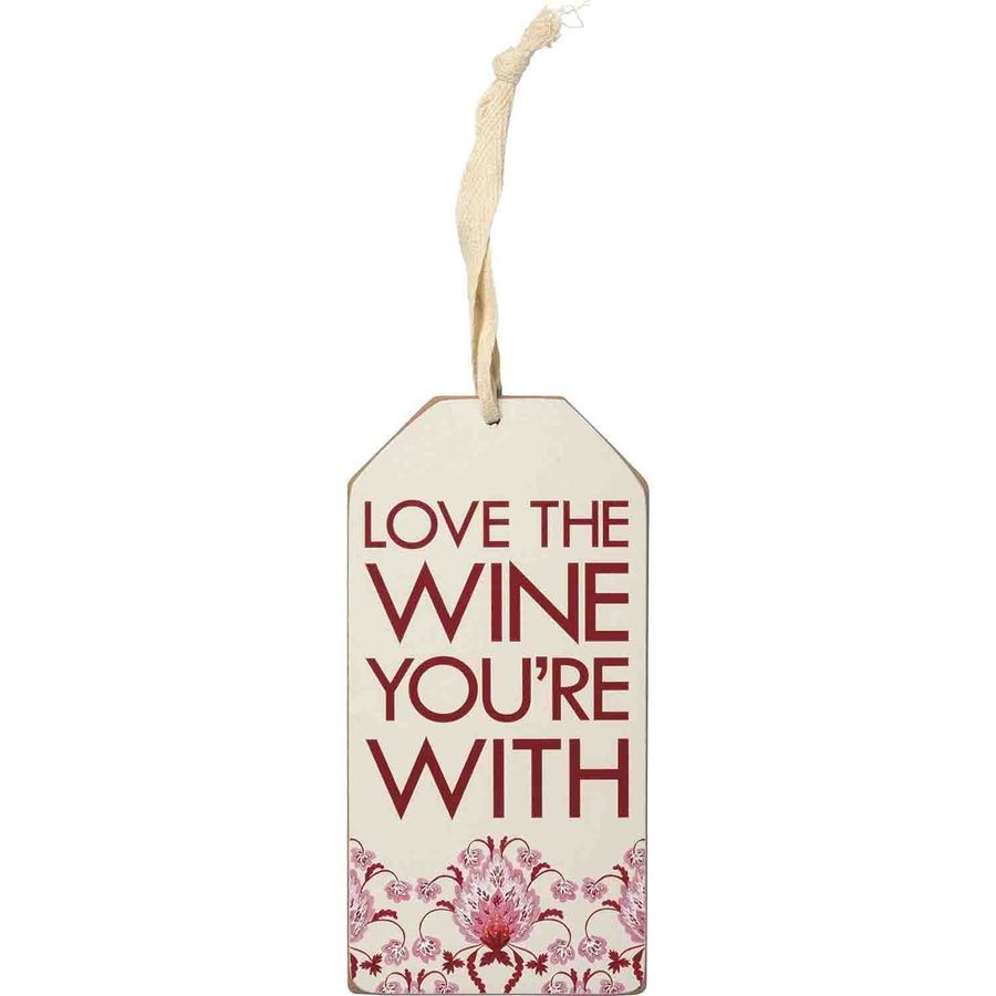 A double-sided wooden bottle tag featuring a "Love the Wine You're With" sentiment with reverse floral pattern in a pink, red and cream palette. Back features coordinating pattern. Contains top fabric loop for attaching to a wine bottle for gifting.