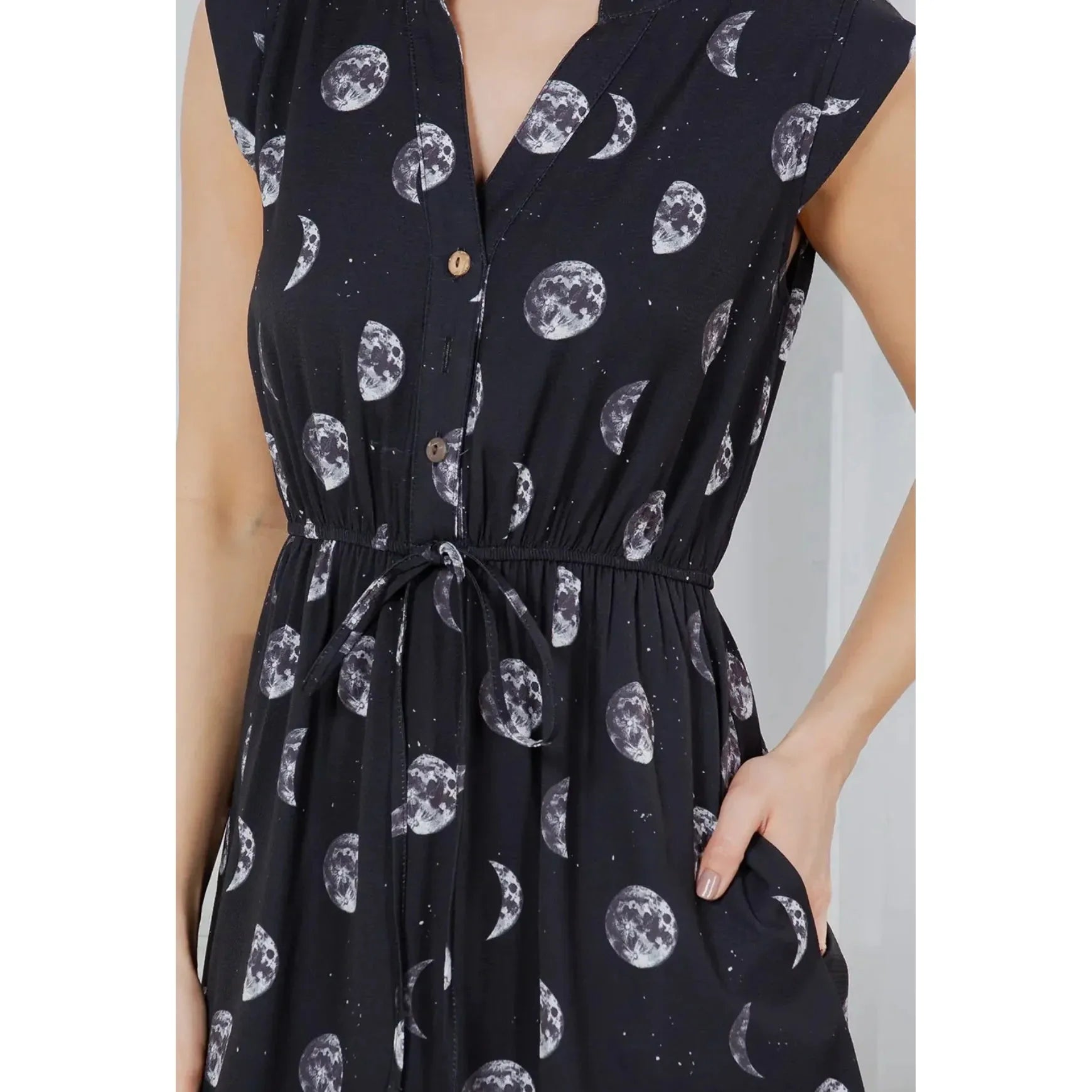 Featuring a stunning moon phases print, buttons, faux drawstring detail, and pockets, this flowy sundress is perfect for any occasion.