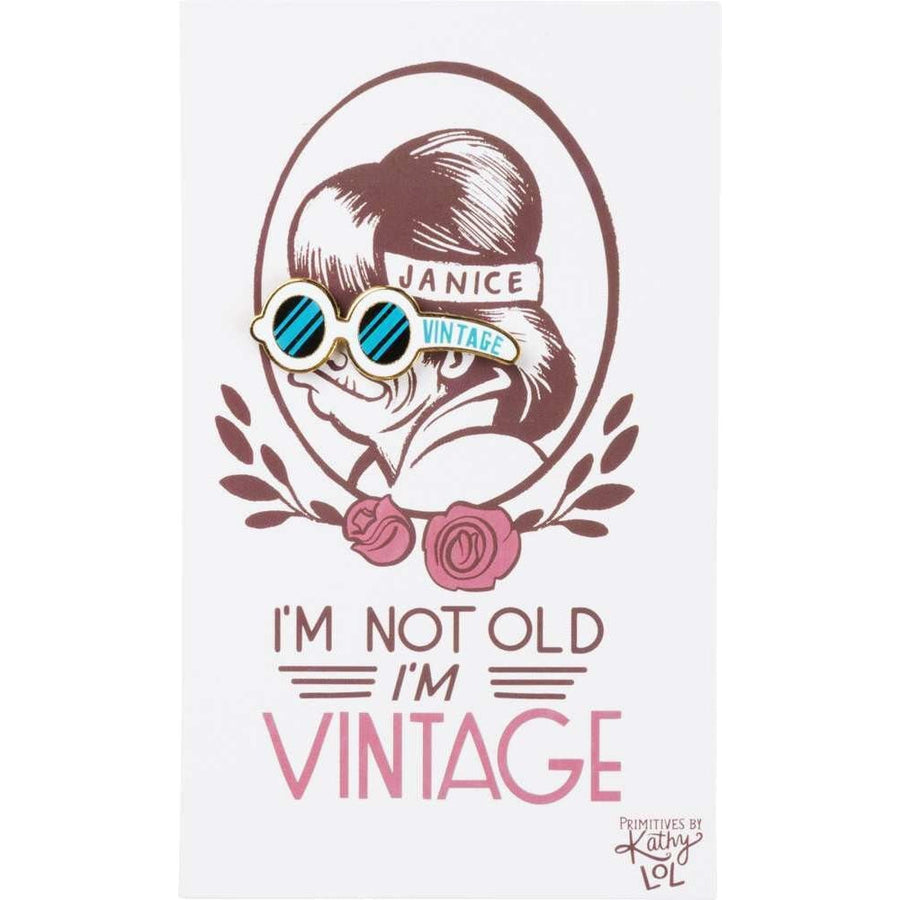A high-quality hard enamel "Vintage" pin in retro sunglasses design with butterfly clip closure. Comes packaged on a double-sided, thoughtfully-coordinated "I'm Not Old - I'm Vintage" card with a blank space on the reverse side for a handwritten note.