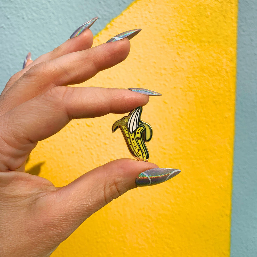 A high-quality hard enamel spotted banana pin with butterfly clip closure. Comes packaged on a double-sided, thoughtfully-coordinated "Young At Heart - Slightly Older In Other Places" card with a blank space on the reverse side for a handwritten note.