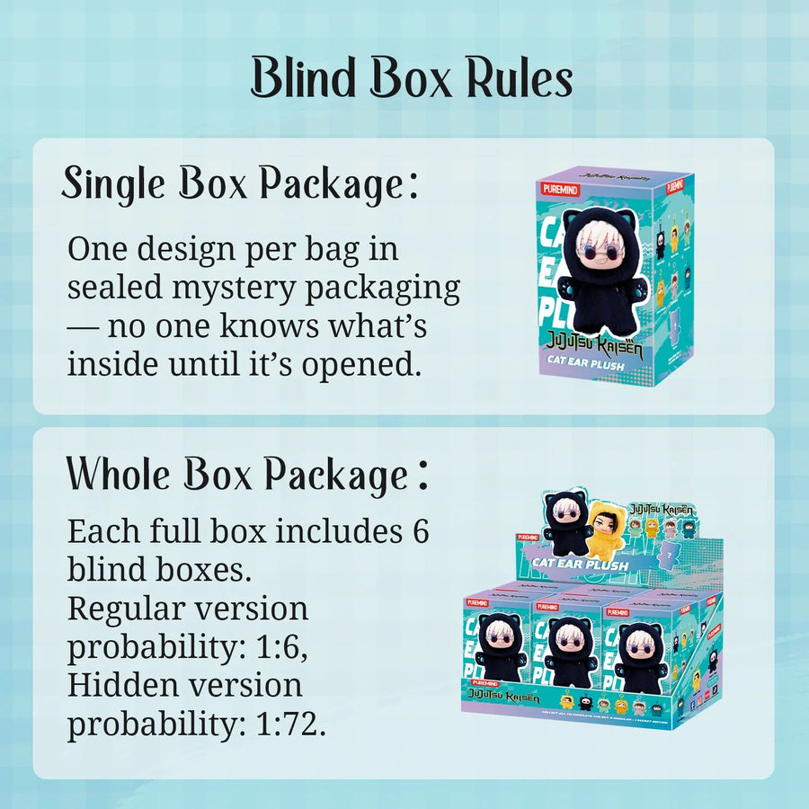 Experience the thrill of unboxing your favorite Jujutsu Kaisen character reimagined as an adorable cat-eared companion. Whether you're a dedicated JJK fan, blind box enthusiast, or plush collector, this series combines the excitement of mystery collecting with the charm of kawaii character design. Display alongside your anime figures, cuddle during marathon viewing sessions, or trade with fellow collectors to complete your set.