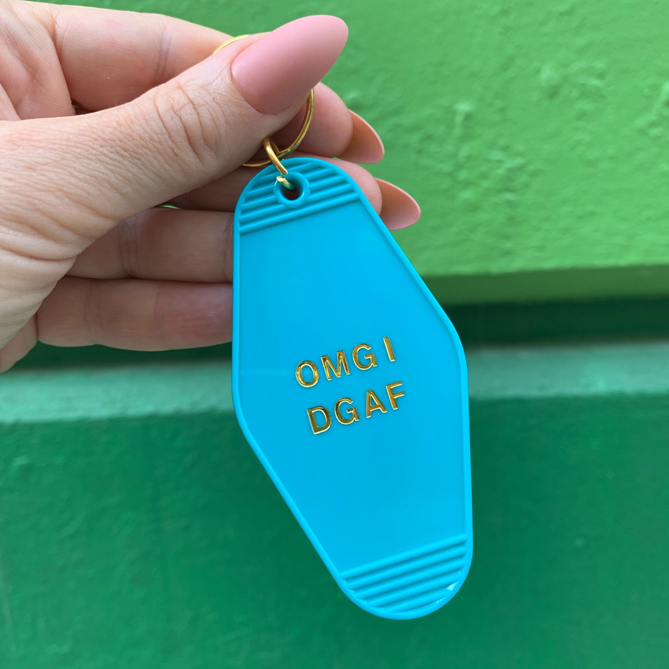 Motel style keychain reads: OMG I DGAF in gold lettering.