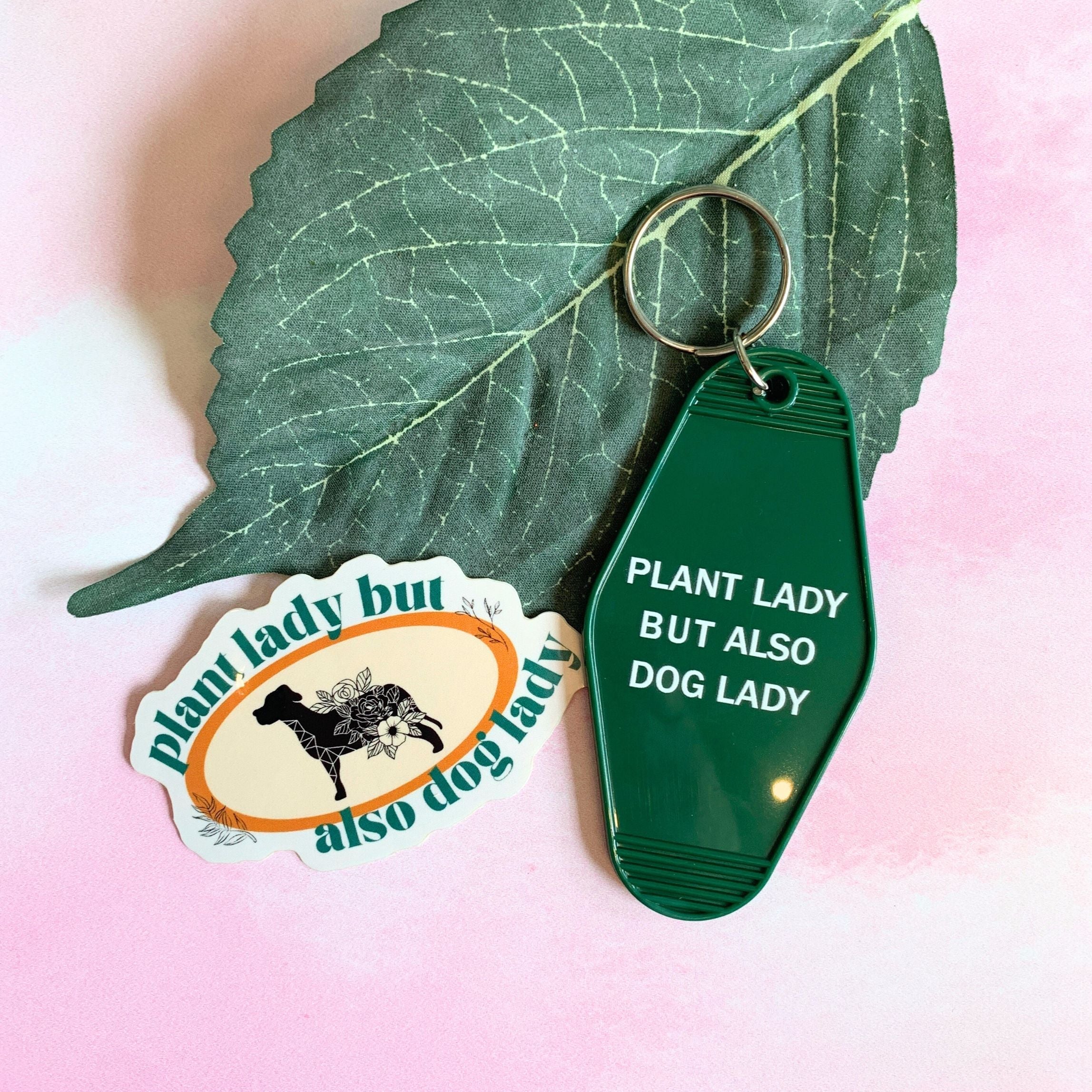 This green Plant Lady But Also Dog Lady Motel Style Keychain is a unique addition to your keys, measuring approximately 3.75"x1.75" and made of plastic and metal. On the back, it says GET BULLISH in small type, making it an exclusive accessory for plant and dog lovers alike.
