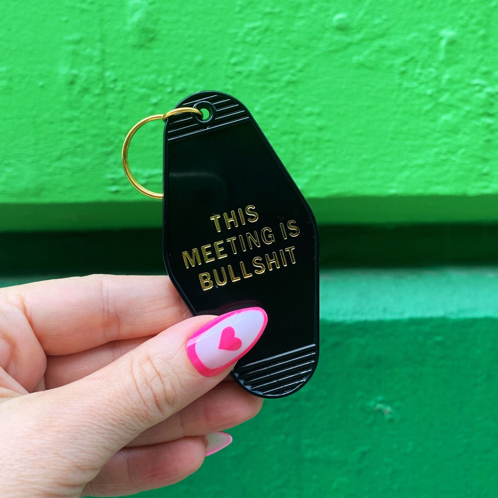 Funny motel style keychain reads: This Meeting is Bullshit in gold lettering.