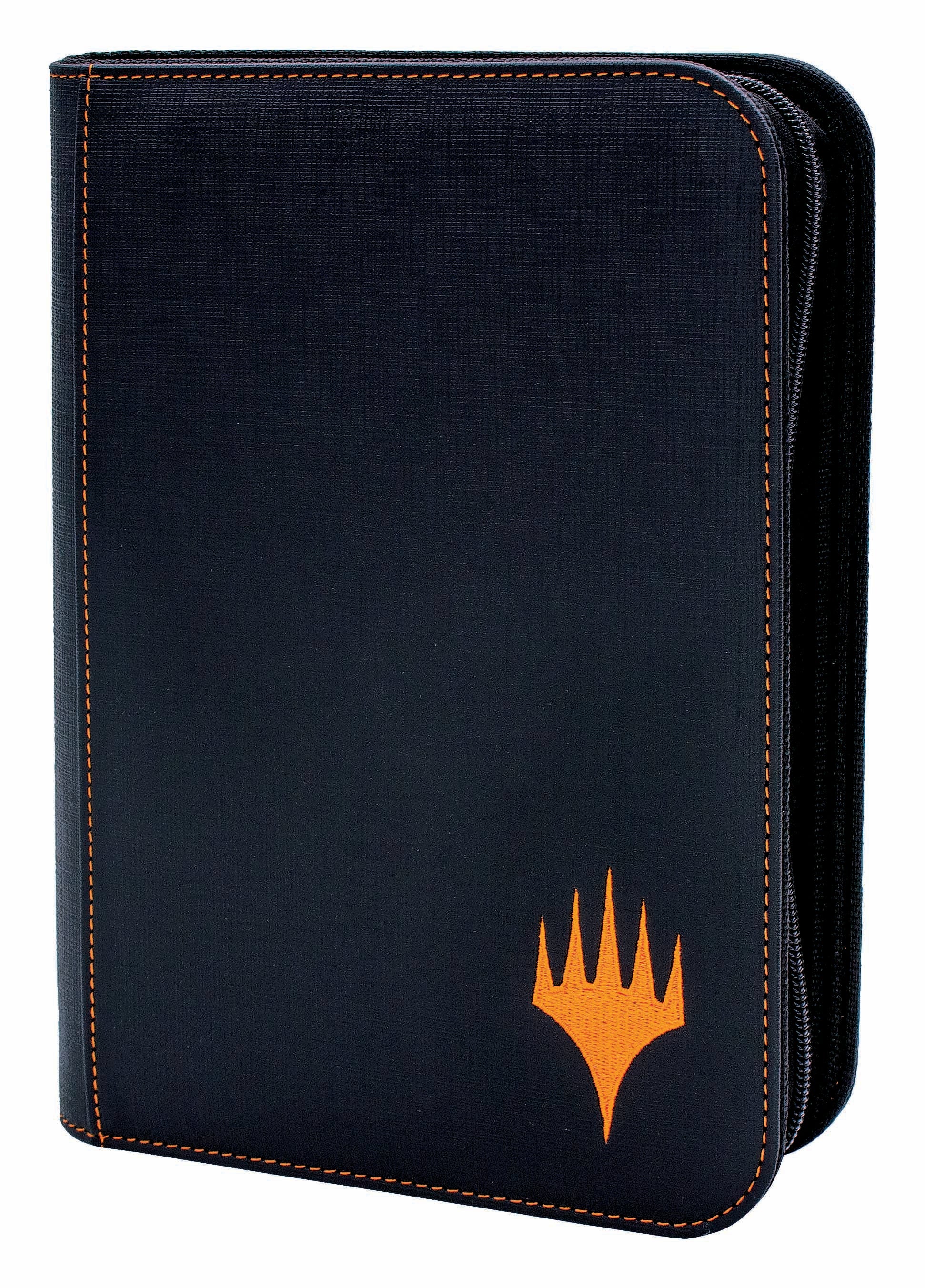 The Mythic Editions are Ultra PRO's most premium accessories for Magic: The Gathering. This 4-Pocket PRO-Binder features a black leatherette material with a mythic orange embroidered Planeswalker symbol and matching stitching. Store and protect up to 160 standard size trading cards sleeved in Ultra PRO Deck Protector sleeves. Each page is backed with a low-friction, black web material to give cards a classic, framed look. The zippered closure and side-loading pockets help prevent your cards from easily falling out. All materials are archival-safe, acid-free, and non-PVC for premium protection.