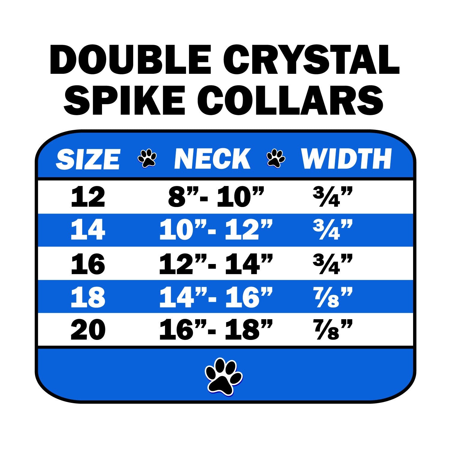 These are 3/4" wide collars with two rows of alternating clear crystals and spikes. There is a lot of bling and attitude packed into these collars!