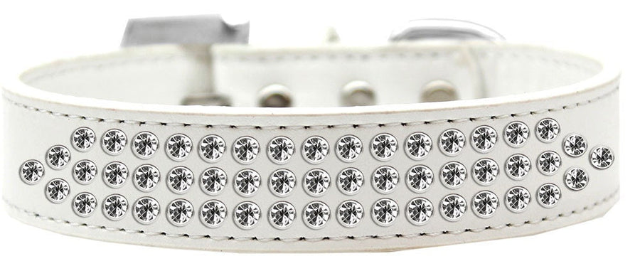 These stellar 3 row crystal collars, are 1" wide and available in sizes 12 thru 20. The crystal buckle enhances the appeal of these collars. See photo's for size chart.