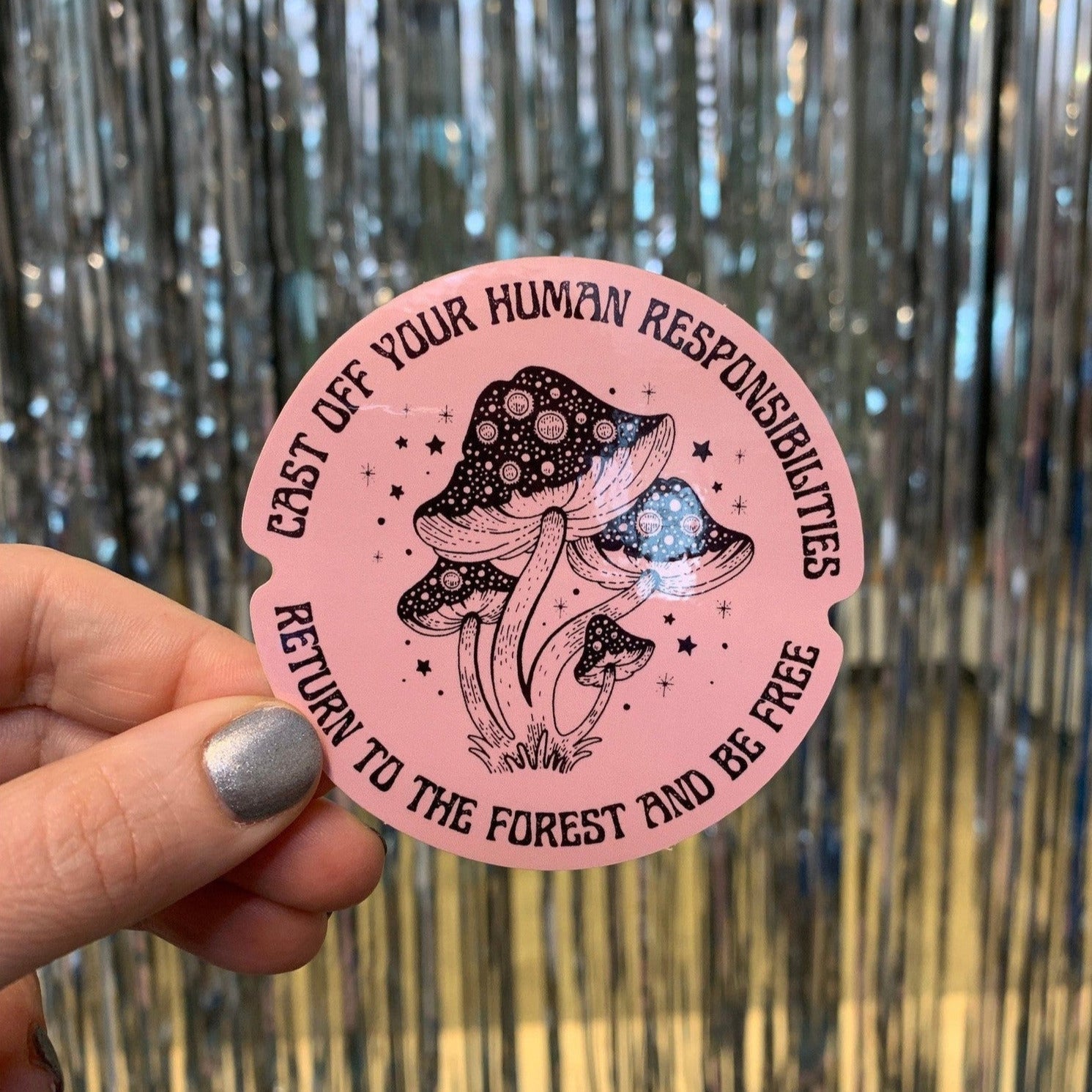 Glossy die cut sticker reads CAST OFF YOUR RESPONSIBILITIES - RETURN TO THE FOREST AND BE FREE with mushrooms and stars at the center.