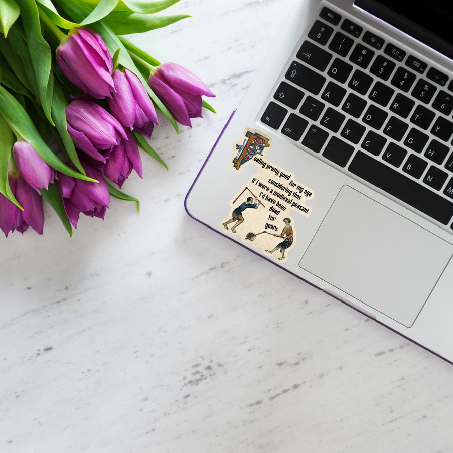 Reads: "Feeling Pretty Good For My Age Considering That If I Were A Medieval Peasant I'd Have Been Dead For Years".