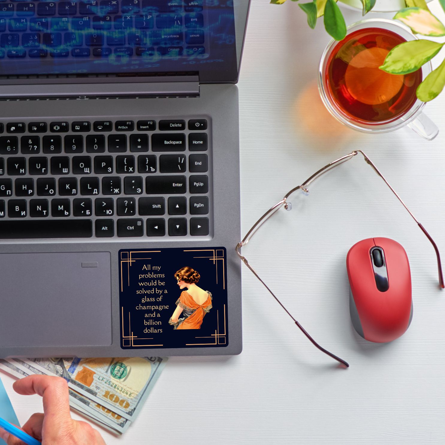 Reads: "All My Problems Would be Solved by a Glass of Champagne and a Billion Dollars".