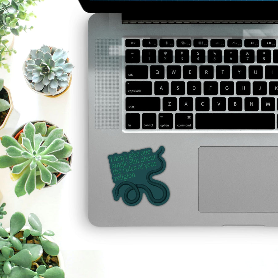 Glossy die cut sticker reads I DON'T GIVE ONE SINGLE SHIT ABOUT THE RULES OF YOUR RELIGION.