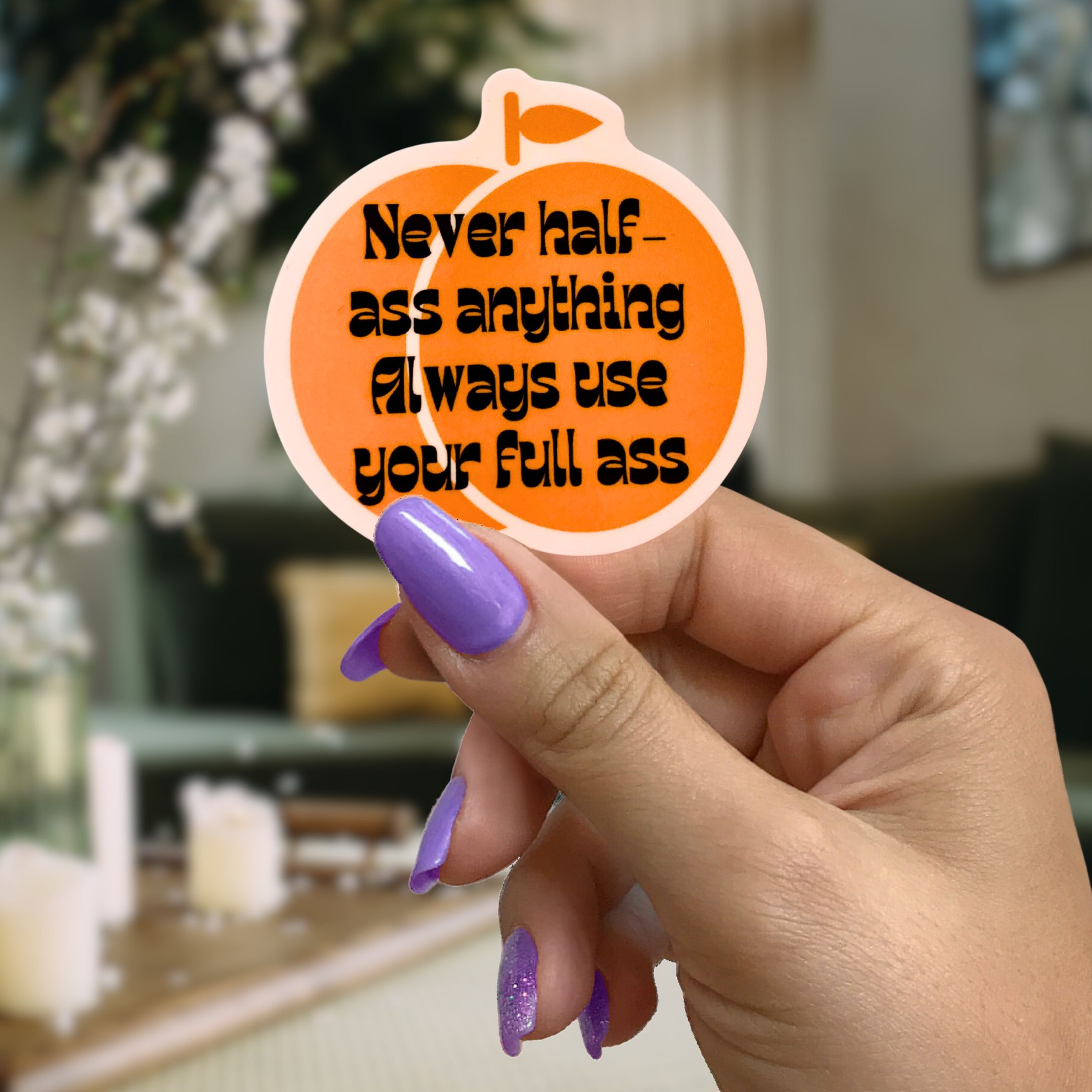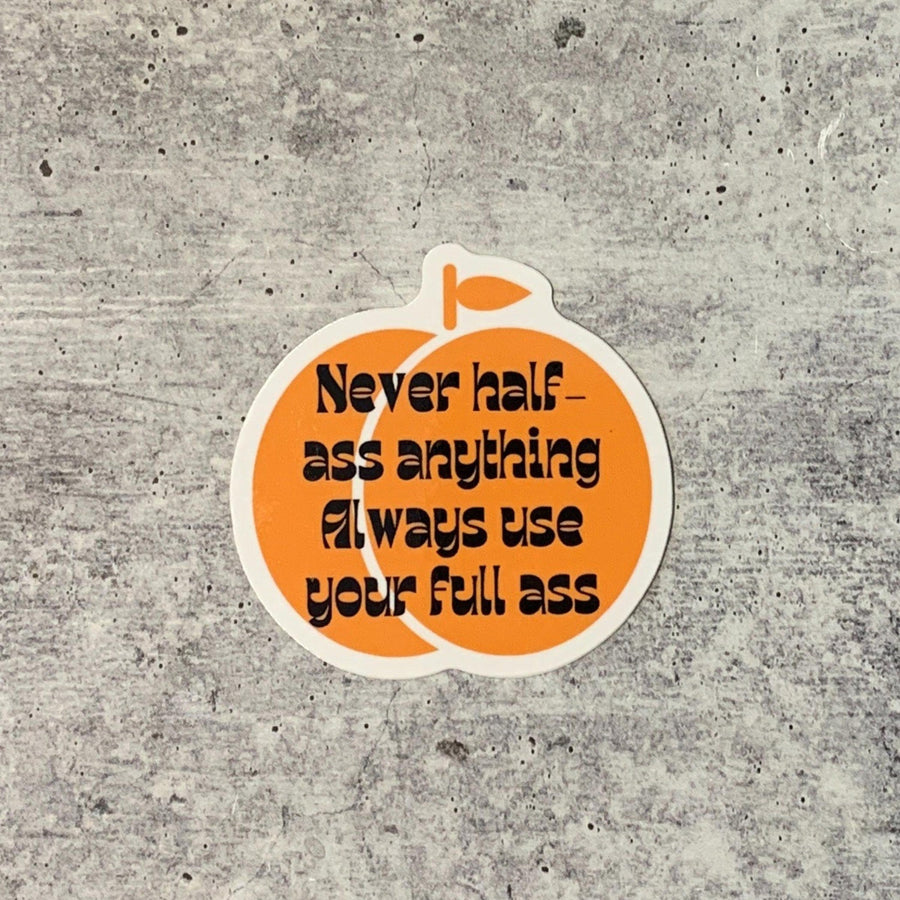 This "Never Half A$$ Anything" vinyl sticker features a bright orange design to stand out and boldly express your message.