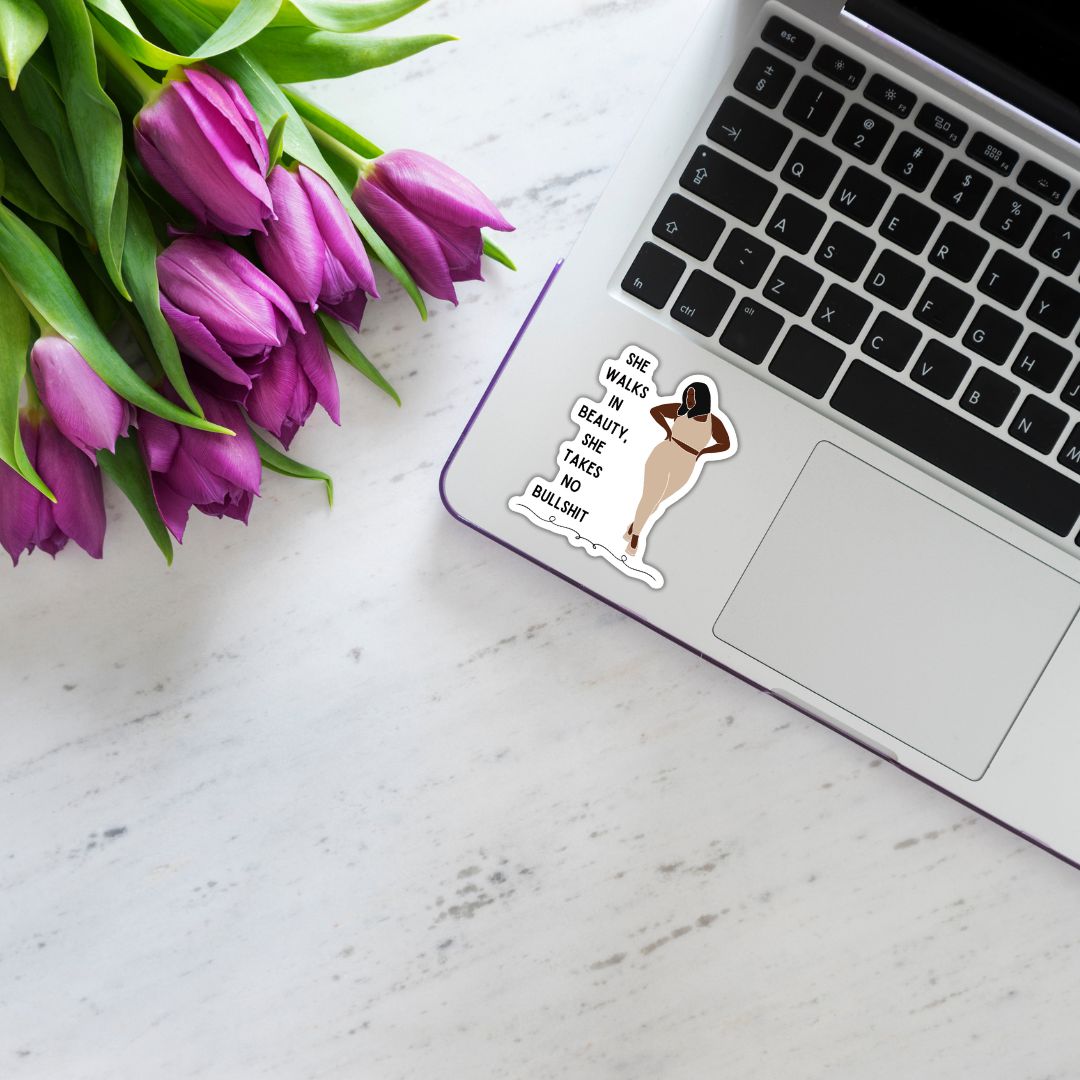 Add a touch of sass and confidence to your laptop or water bottle with the She Walks in Beauty 💃, She Takes No Bullshit vinyl sticker. This inspiring design celebrates strong Black women and is perfect for those who want to show off their bold personality. Looking for a unique and empowering gift? Give the She Walks in Beauty, She Takes No Bullshit sticker to a friend who needs a little extra motivation in their day. This glossy finish sticker is UV-resistant and made to last on any surface, making it a practical and stylish present for anyone in your life.