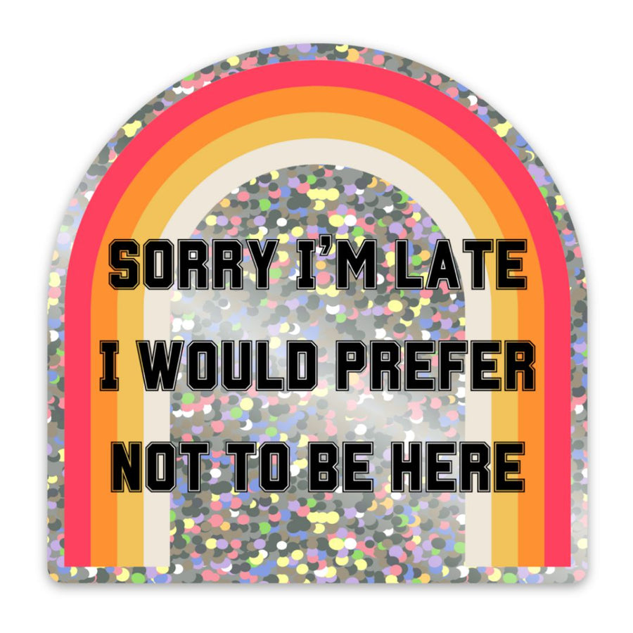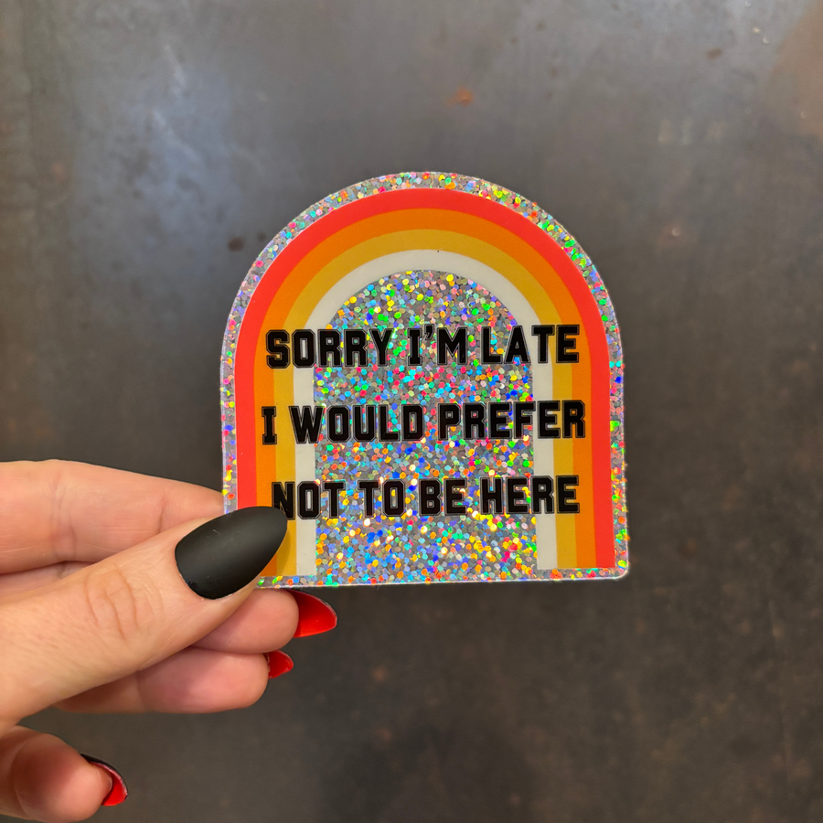 Add a touch of sass to your laptop, water bottle, or bike with the Sorry I'm Late I Would Prefer Not To Be Here Glitter Sticker. Perfect for those who appreciate a good laugh and stand out with unique accessories. Looking for a fun and quirky gift for your sarcastic friend? The Sorry I'm Late I Would Prefer Not To Be Here Glitter Sticker is sure to bring a smile to their face.