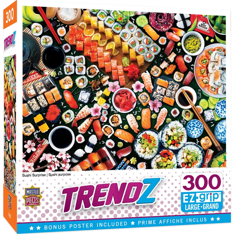 This MasterPieces 18" x 24" 300pc EZ Grip Trendz Collection features hip images of favorable styles, or influences we see trending today. Bright and colorful sushi for the refined foodies. The particular style of today's nigirizushi became popular in contemporary Tokyo in the 1820s or 1830s. The EZ-Grip die-cut used to make this puzzle offers larger puzzle pieces that snap together perfectly, without compromising image quality. To reduce its impact on our environment, the chipboard used in this puzzle is made of 100% recycled material.