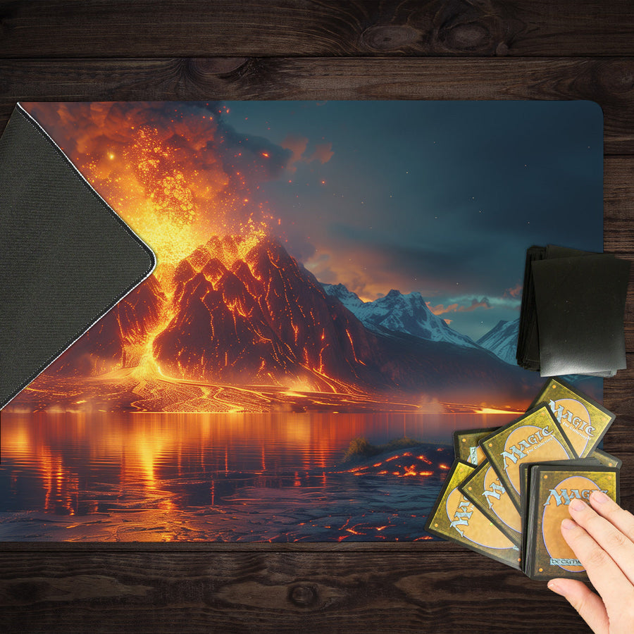 Oversized Playmat measures at 28” x 14” inches and is 1/16 of an inch thick. It’s made with a smooth cloth top and strong rubber backing.